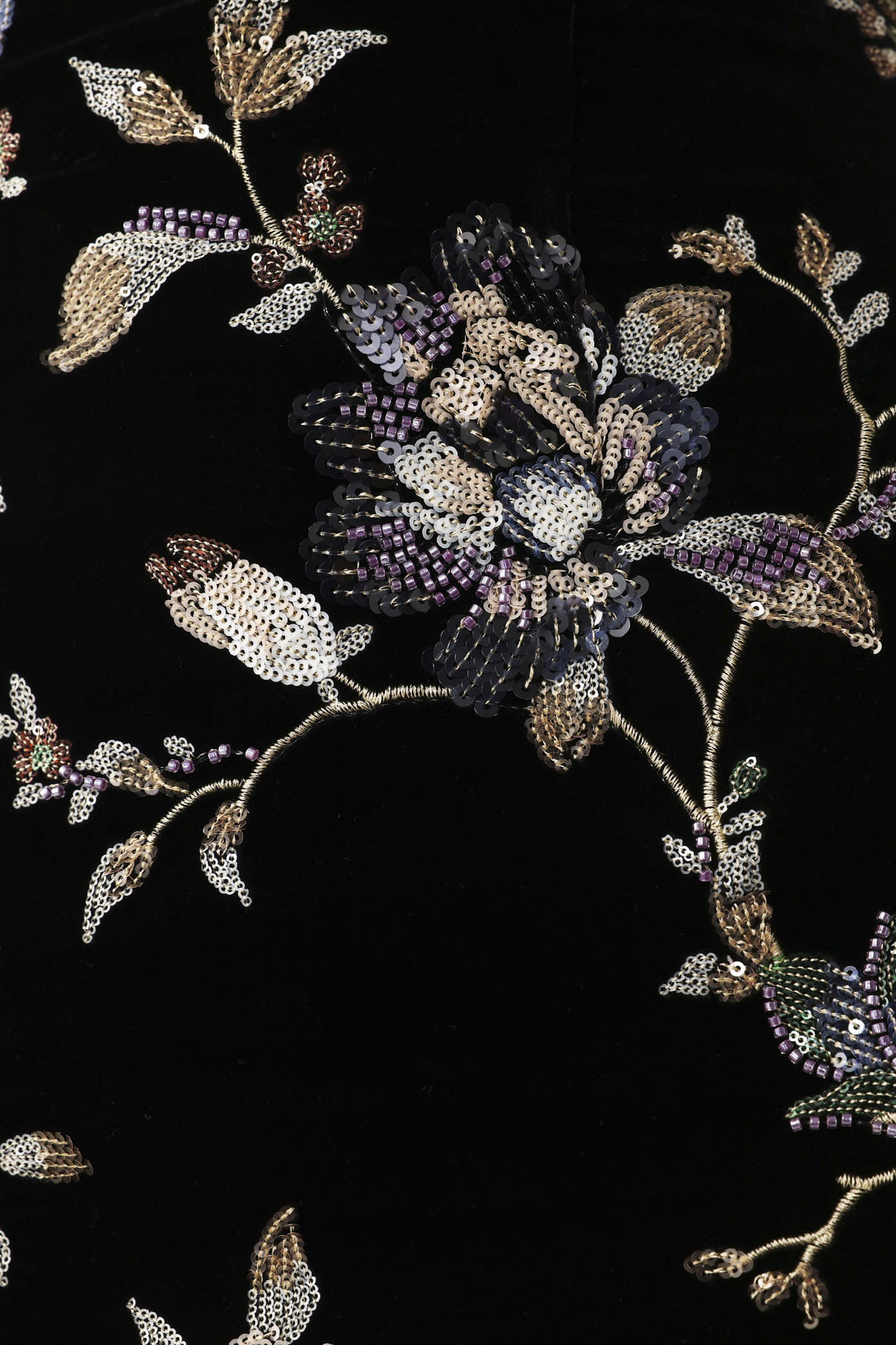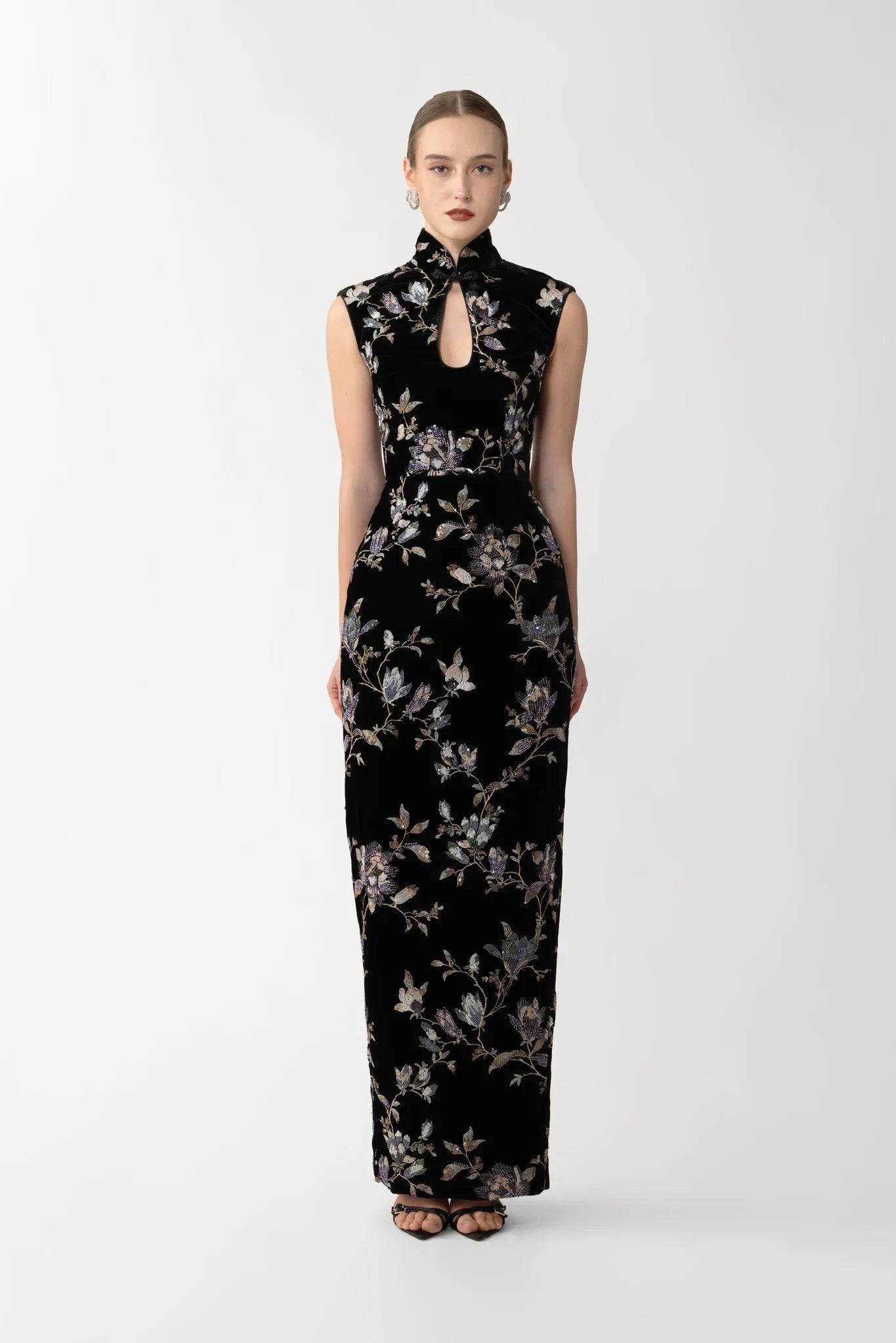 The Liliana Dress is a cheongsam-inspired gown cut from silk velvet. Featuring a mandarin collar, cap sleeves, and a keyhole cutout, it is adorned with tonal embroidered florals.