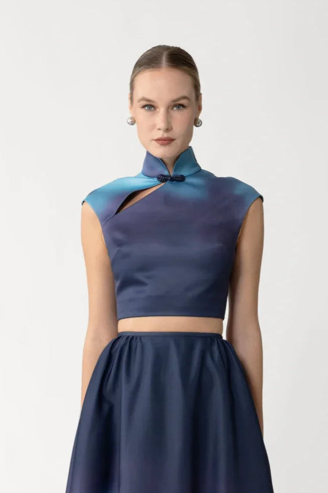 The Mai Top is a cropped satin piece defined by its mandarin collar and hand-tied pipa knot at the neckline. Designed to pair with the matching Mai Skirt.