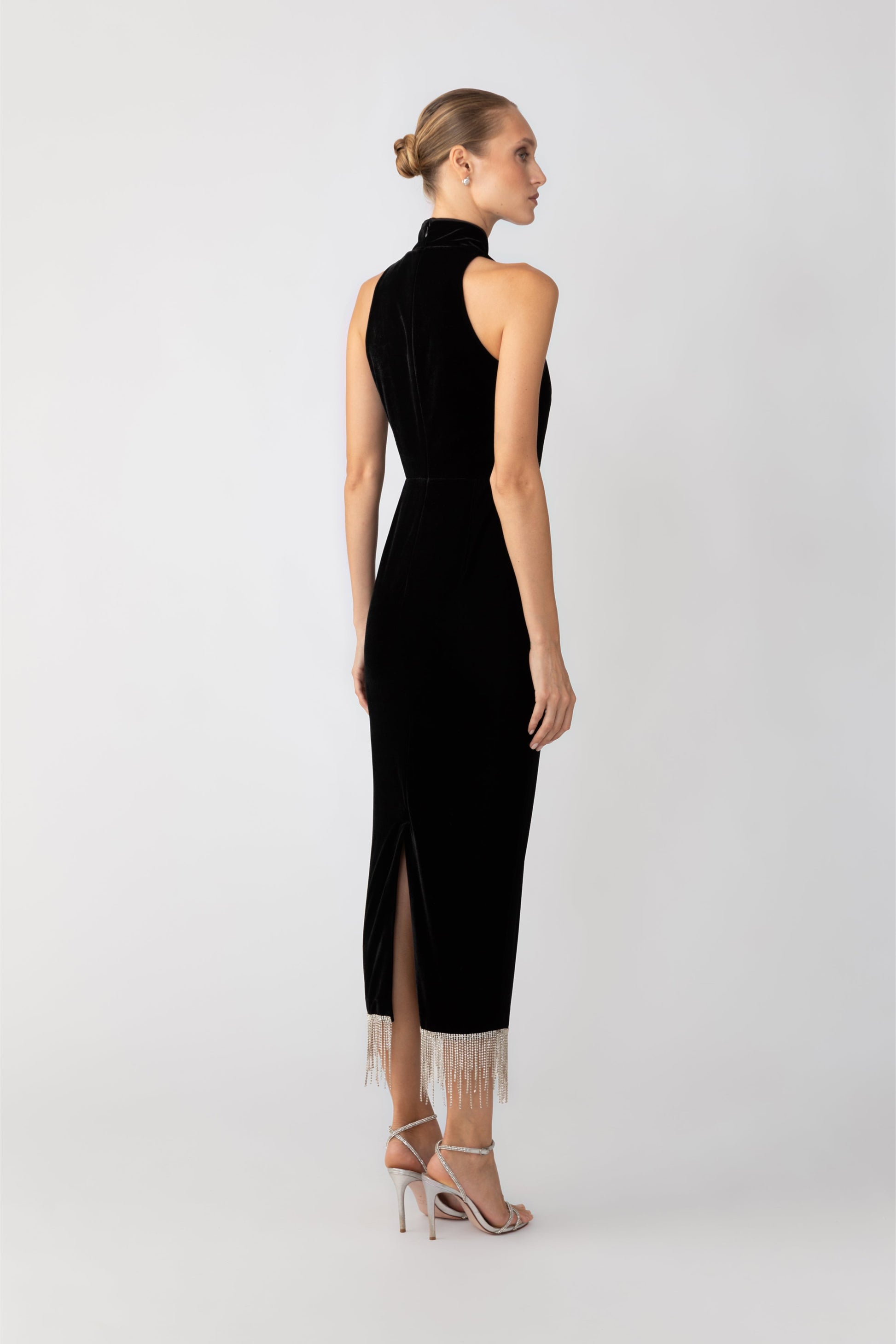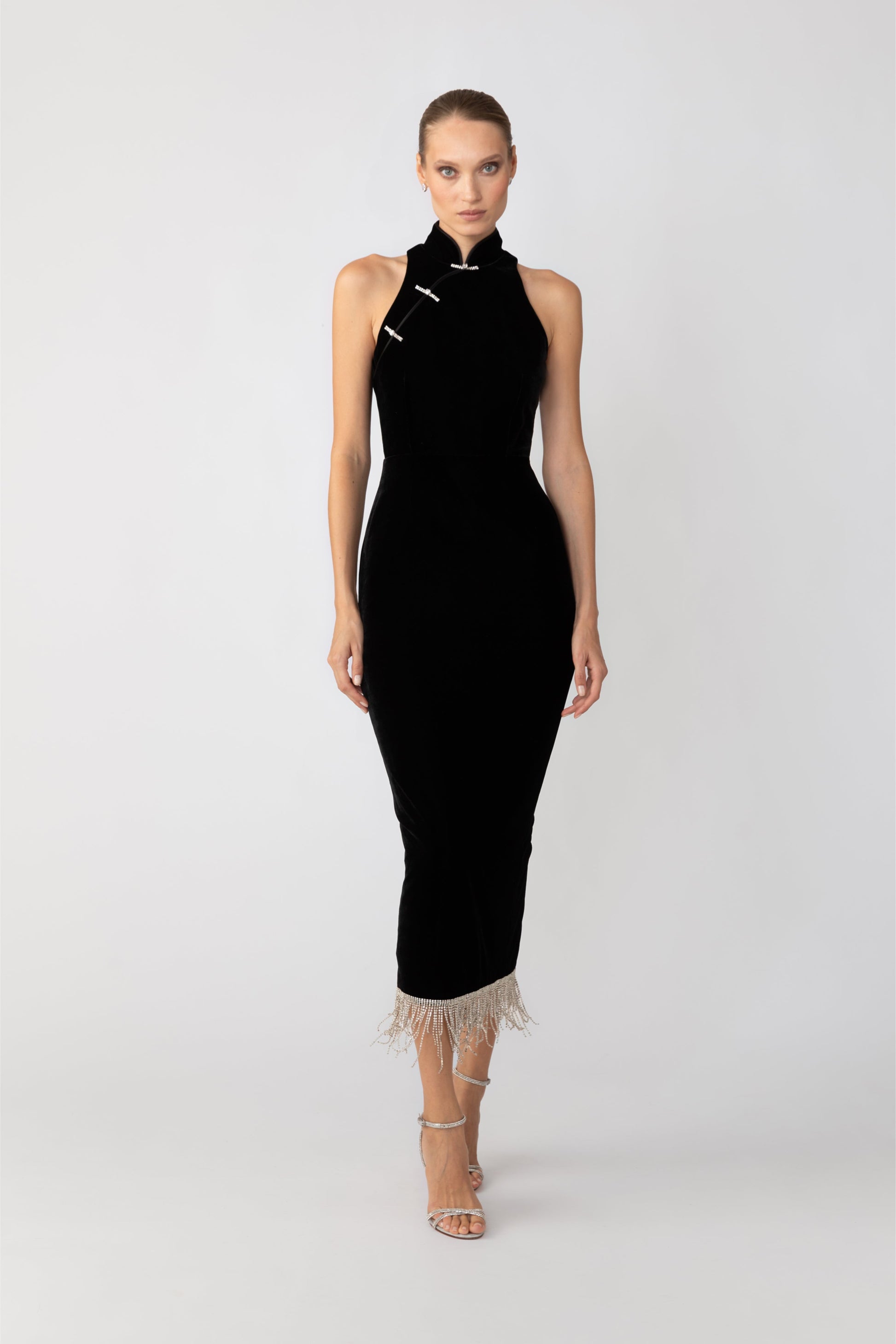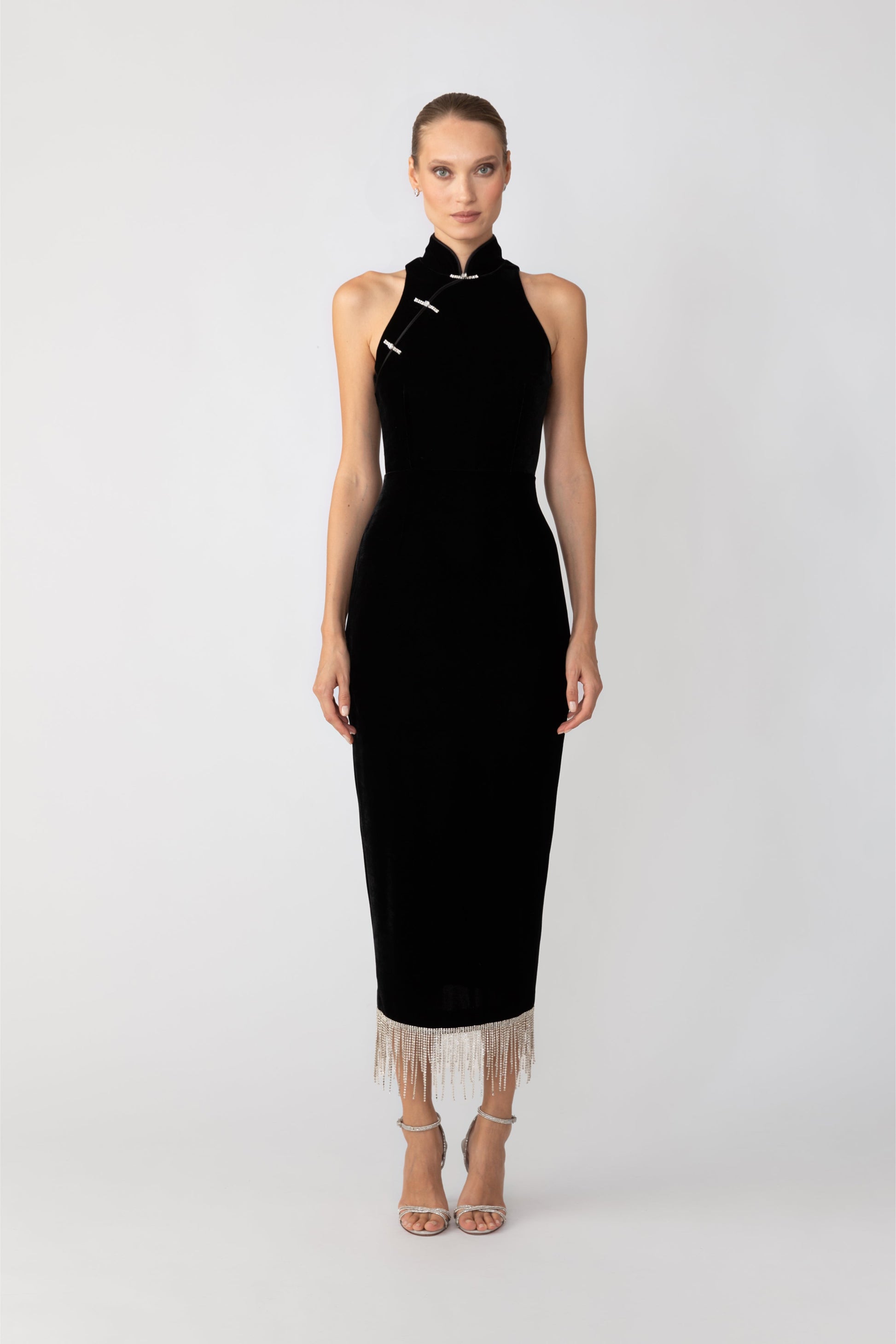 Modern Cheongsam midi dress with pencil skirt silhouette and a Mandarin collar featuring straight crystal pankou button detail