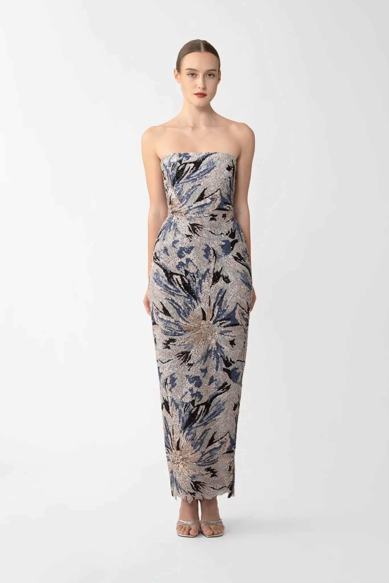 The Meryl Dress is drenched in sequins and cut in a strapless midi silhouette. The fully boned neckline elongates the frame.