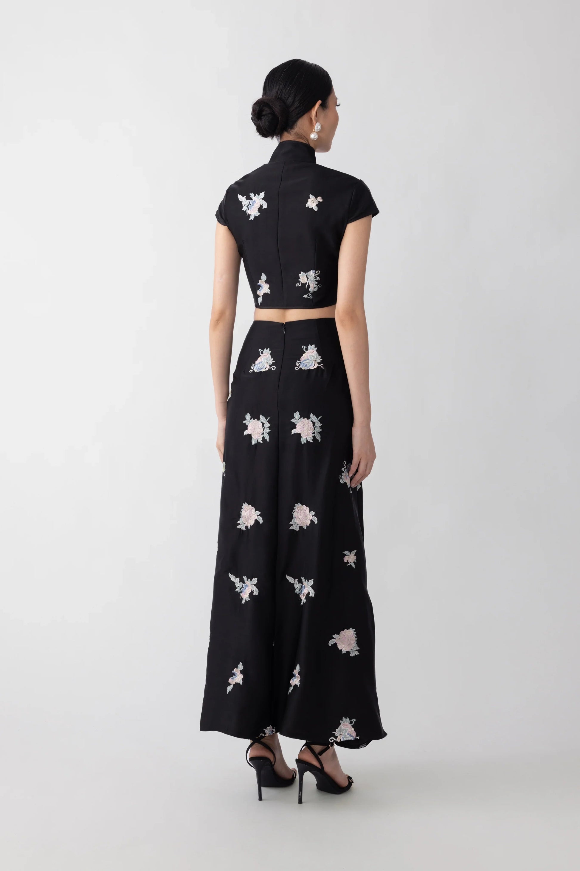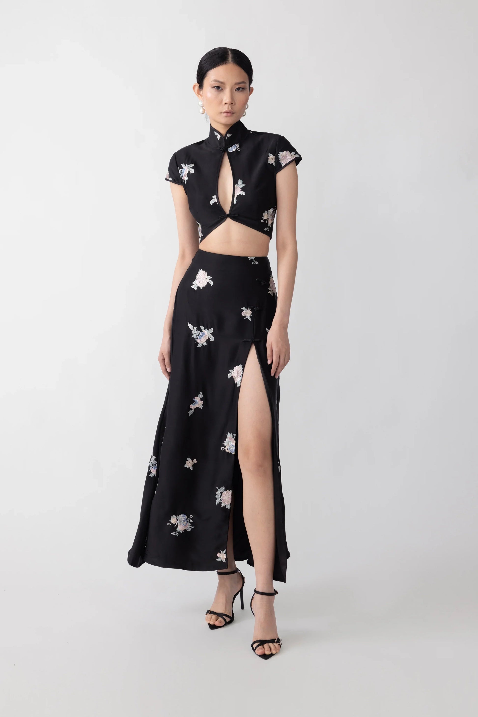 Embroidered satin set with a Chinese top featuring a keyhole cut out and a flowy maxi skirt