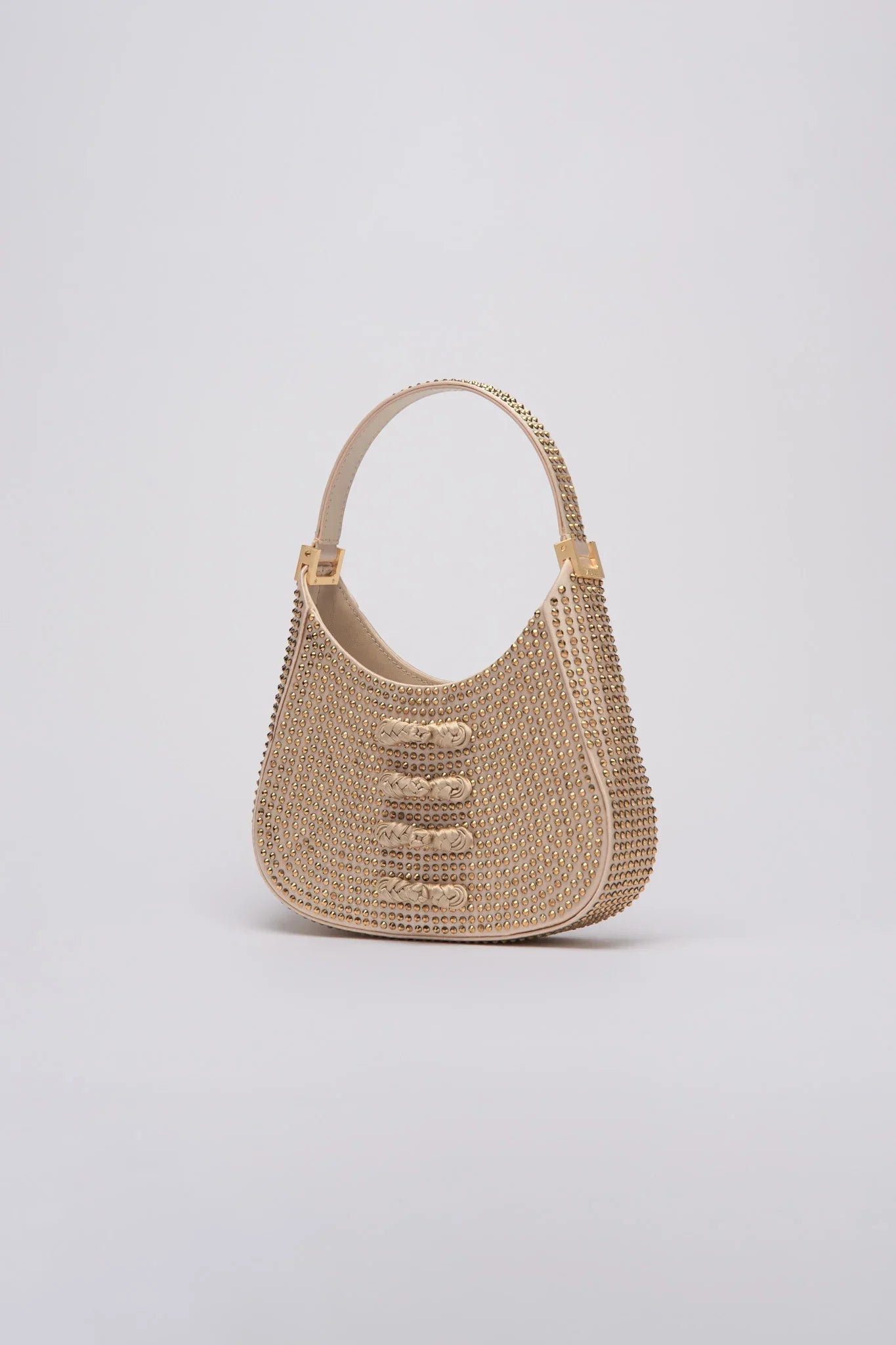 Our pipa-shaped mini bag crafted from deluxe satin with a leather base and handle. Adorned with premium tone-on-tone color crystals and our signature hand-tied pipa knot buttons. Adding that extra bit of sparkle to complete the look. The mini sau is the perfect size to carry what you need while looking chic on any occasion.