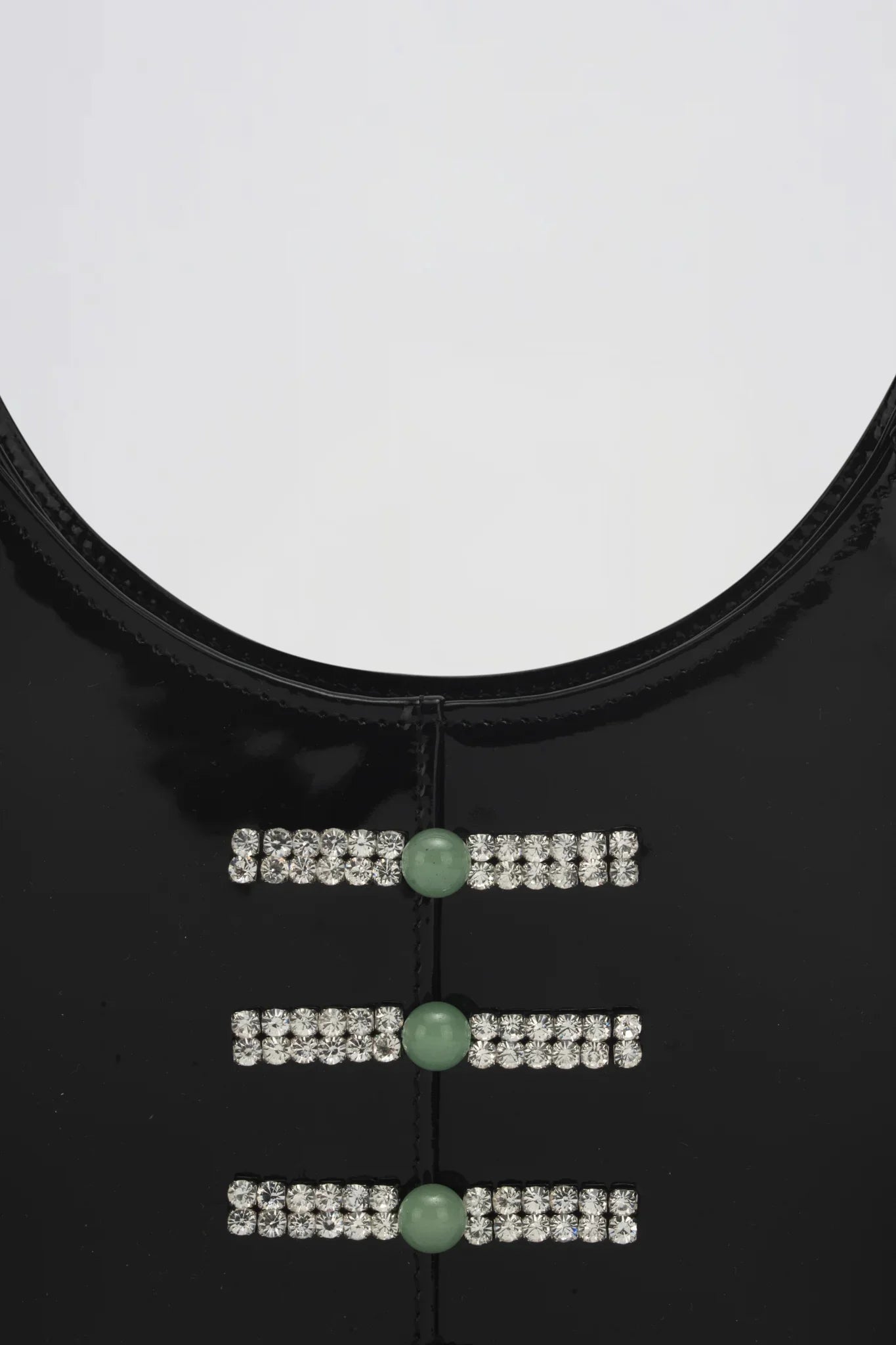 Our updated pipa-shaped mini bag crafted from premium patent leather with classic leather base and handle. The glossy finish is extra-shiny adorned with new button detail featuring translucent crystals and green jadeite. A sophisticated touch to complete your elevated look. The mini sau is the perfect size to carry what you need while looking chic on any occasion.