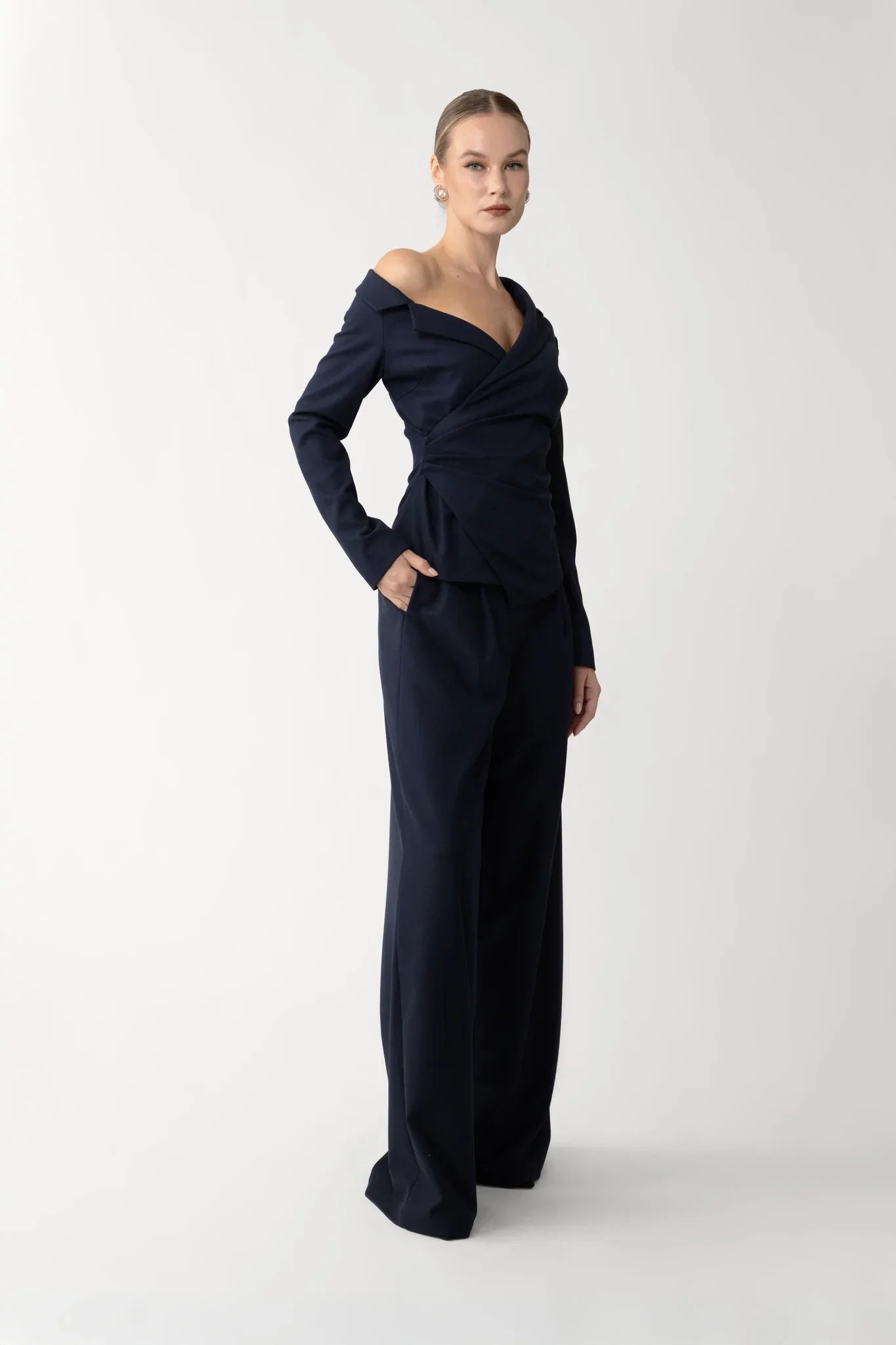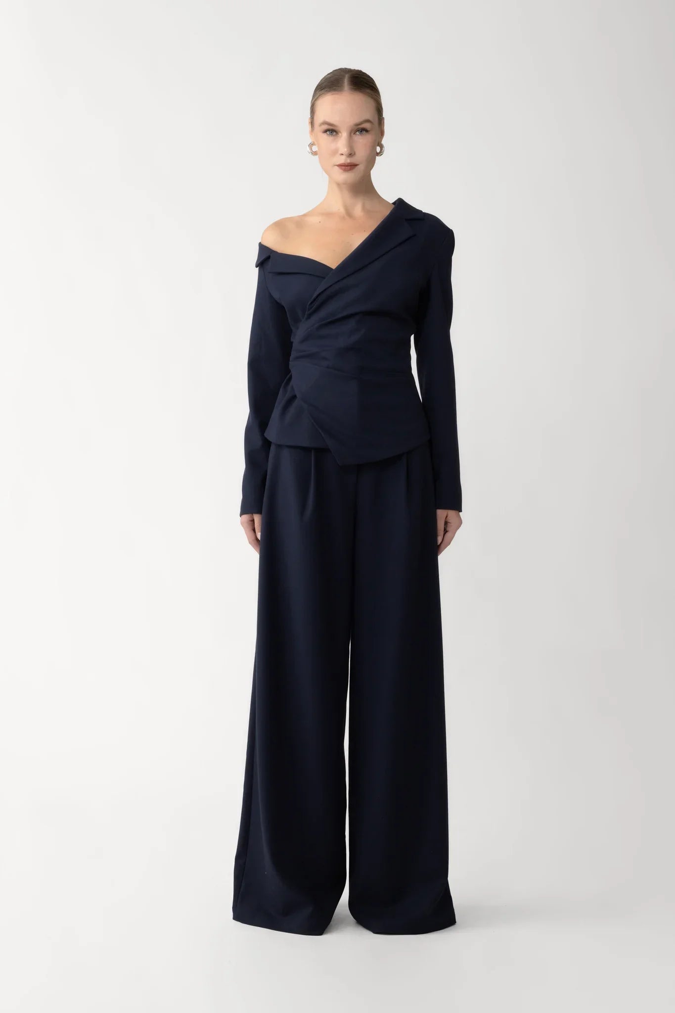 The Neve Pant is a wide-leg tailored style crafted from wool blend. Featuring a fluid cut that elongates the silhouette, it’s designed to pair with the Neve Top for a modern workwear ensemble.