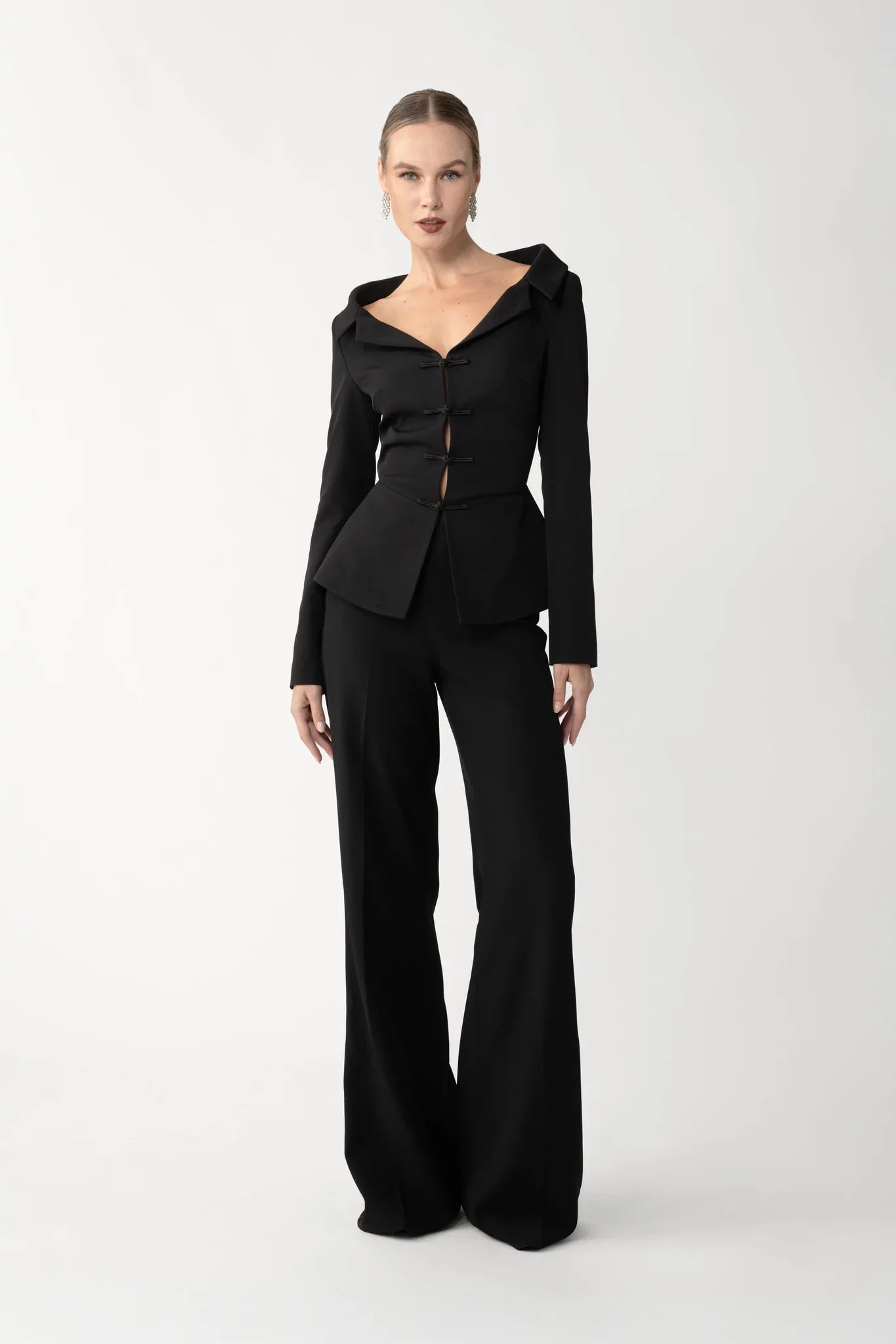 This medium-weight crepe top is tailored off the shoulder for a flattering fit that sculpts the bust and cinches the waist with classic pankou buttons. Pair this with the Niope Pant for a complete look