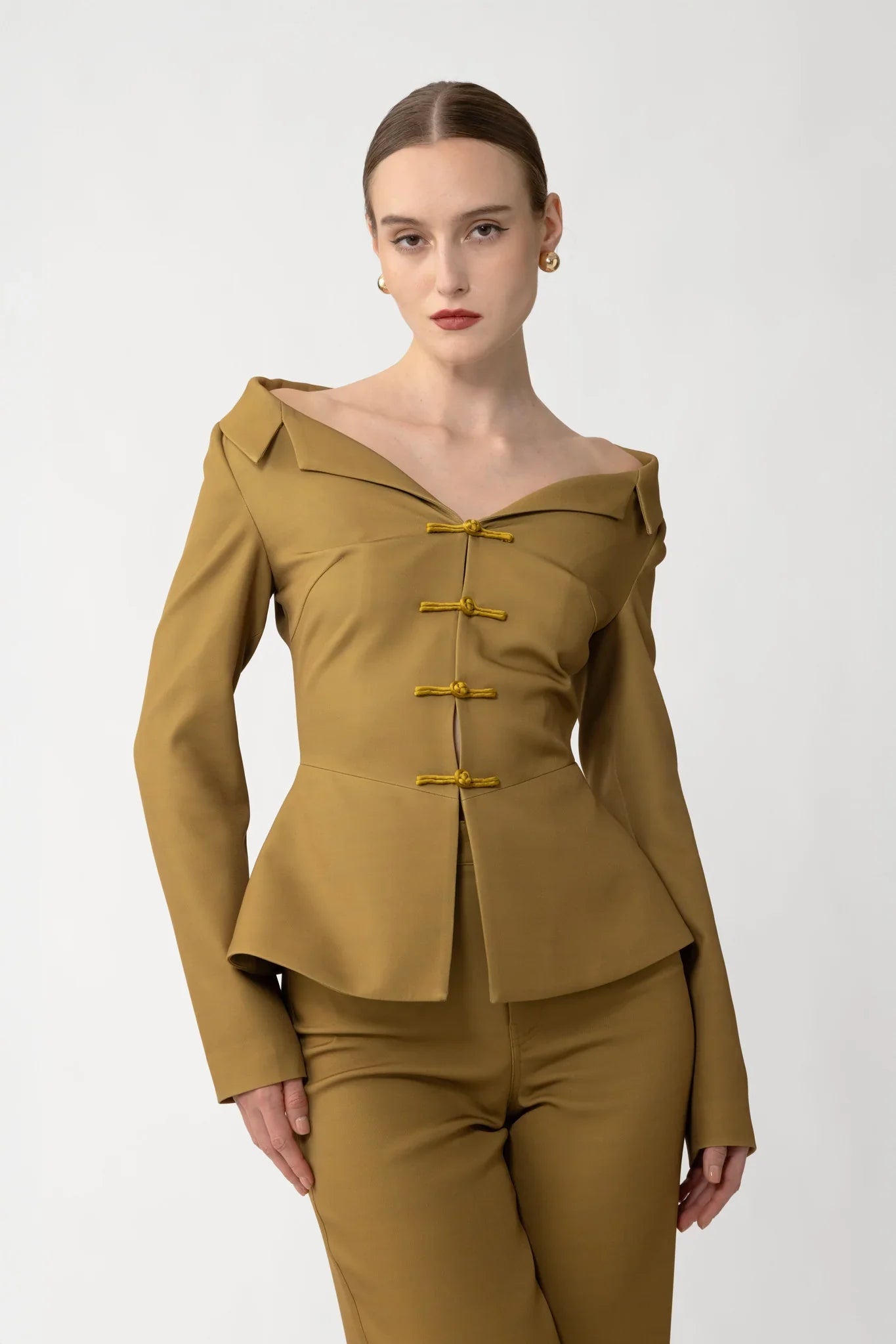 This medium-weight crepe top is tailored off the shoulder for a flattering fit that sculpts the bust and cinches the waist with classic pankou buttons. Pair this with the Niope Pant for a complete look