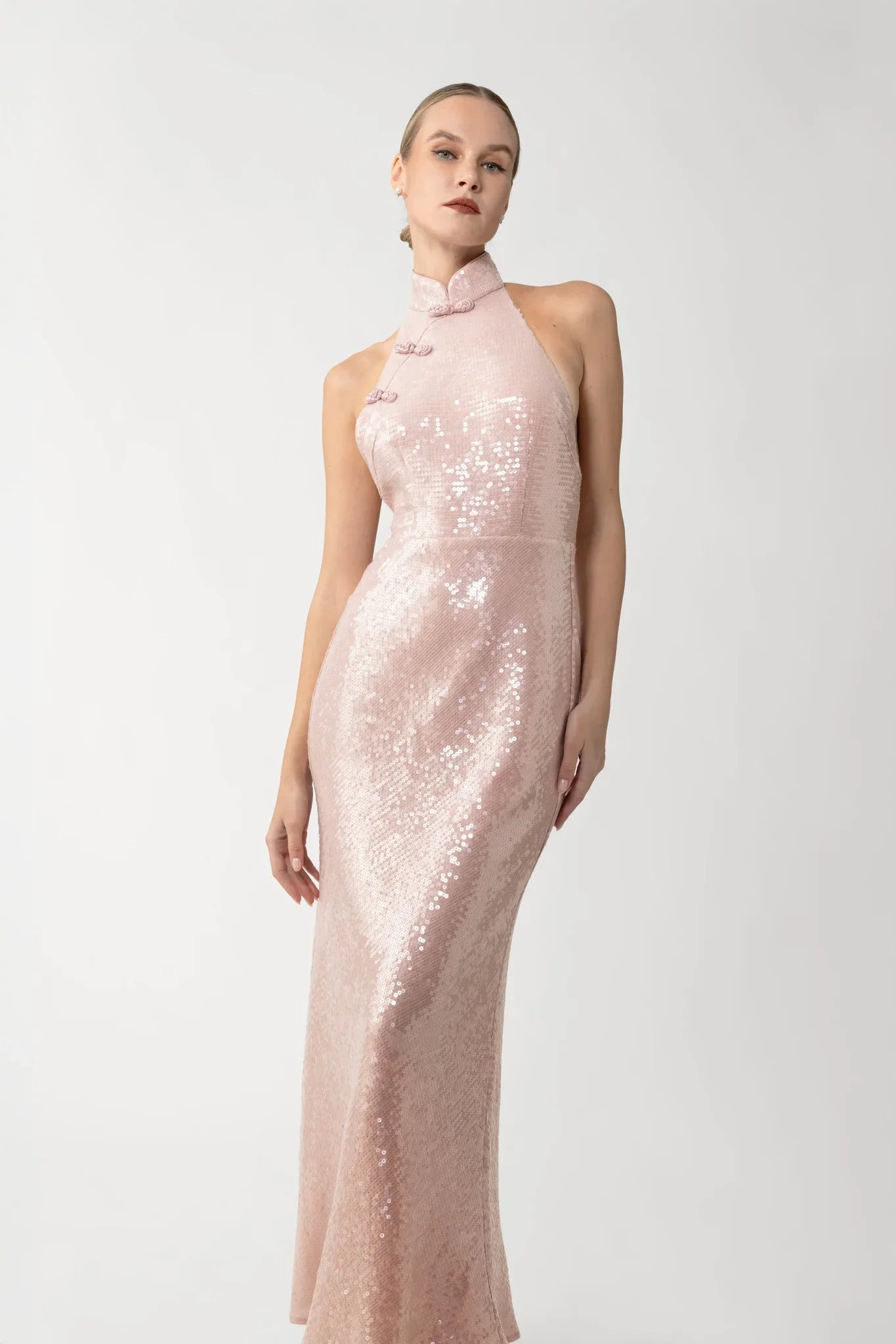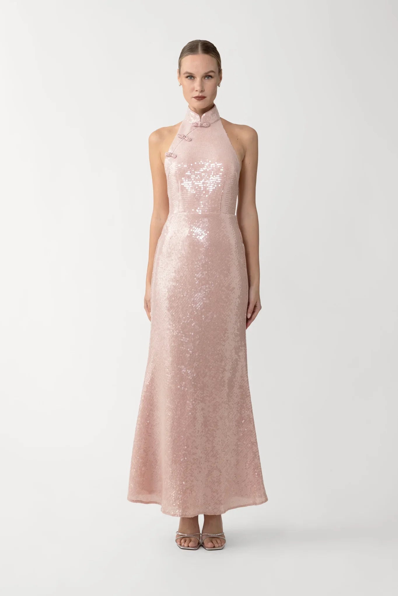 The Ophelia Dress is cut from shimmering sequins that contour the body and flow into a softly flared hem. Featuring a halter neckline and open-back design, it’s finished with a signature mandarin collar and hand-tied pipa knot detailing.