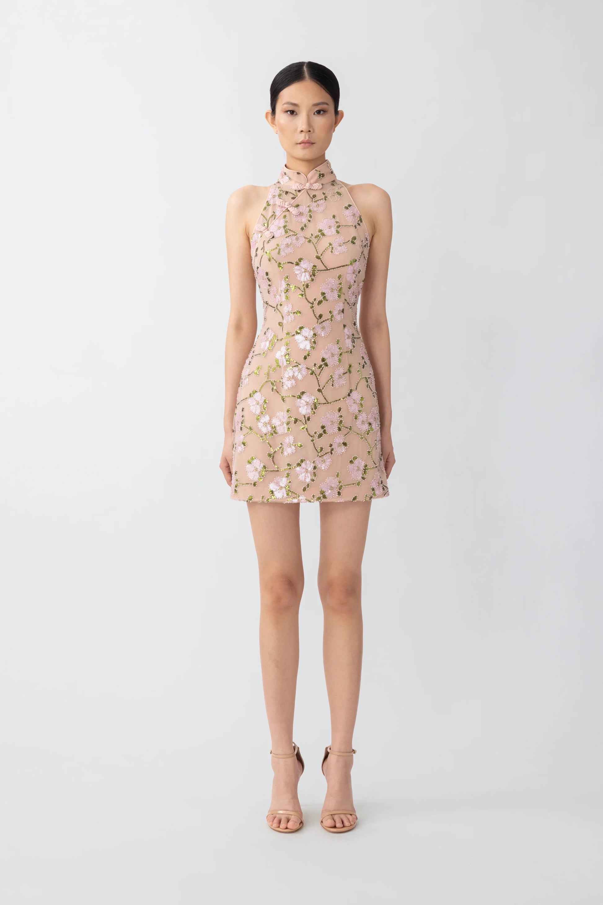 Fully beaded Cheongsam mini dress with a racerback and a Mandarin collar featuring our signature hand-tied pipa knot button detail