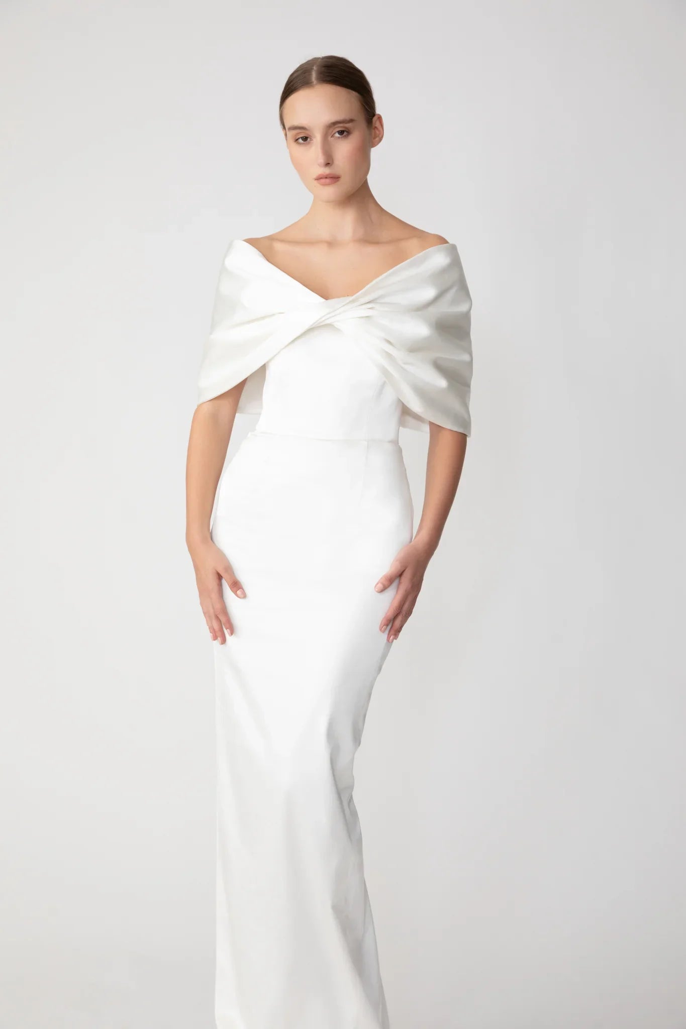 Paloma is a glamorous statement gown crafted from stretchy satin fabric featuring a boned bodice, fitted full-length column skirt, and large twist-bow wrapped around the shoulders. Perfect for black-tie events, galas and celebratory occasions, make heads turn and hearts skip a beat with Paloma.