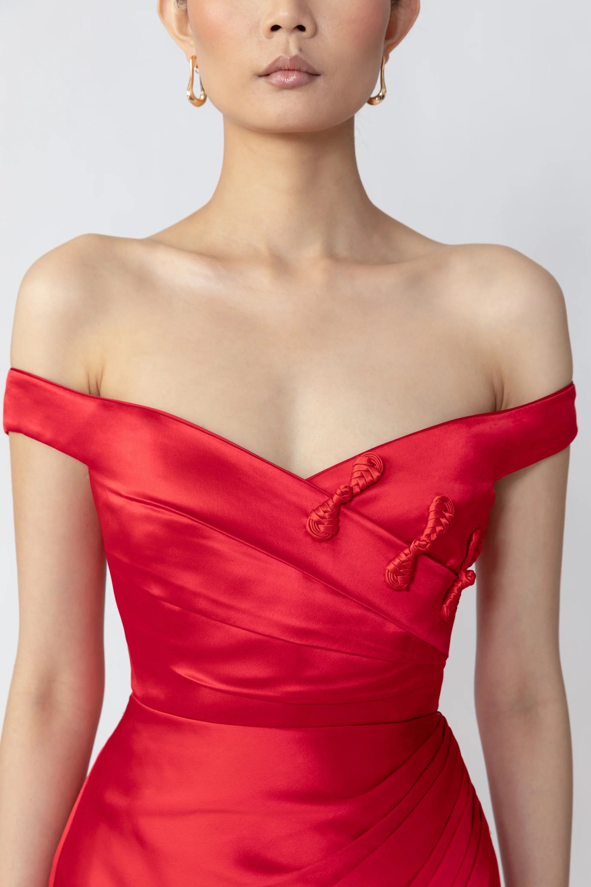 Off-shoulder satin gown with a full-length wrap and draped skirt featuring our signature hand-tied pipa knot button detail