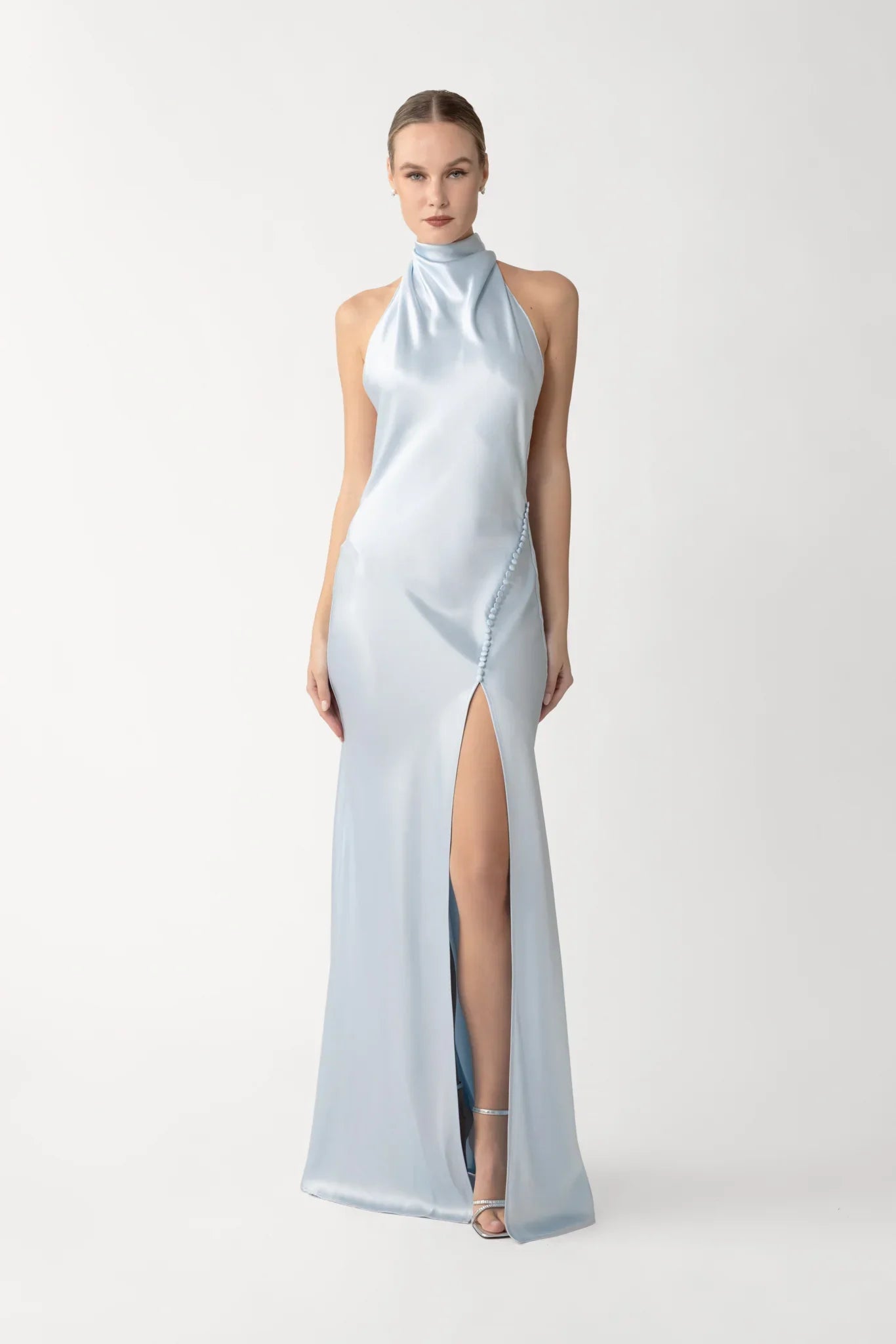 Penelope is our top bestseller that is guaranteed to make you feel effortlessly beautiful and captivating. A stunning bias-cut satin gown featuring a high neck, a low-cut back and open sides, a thigh-high side slit with covered button detail at the hip, and large statement wings at the back of the neck.