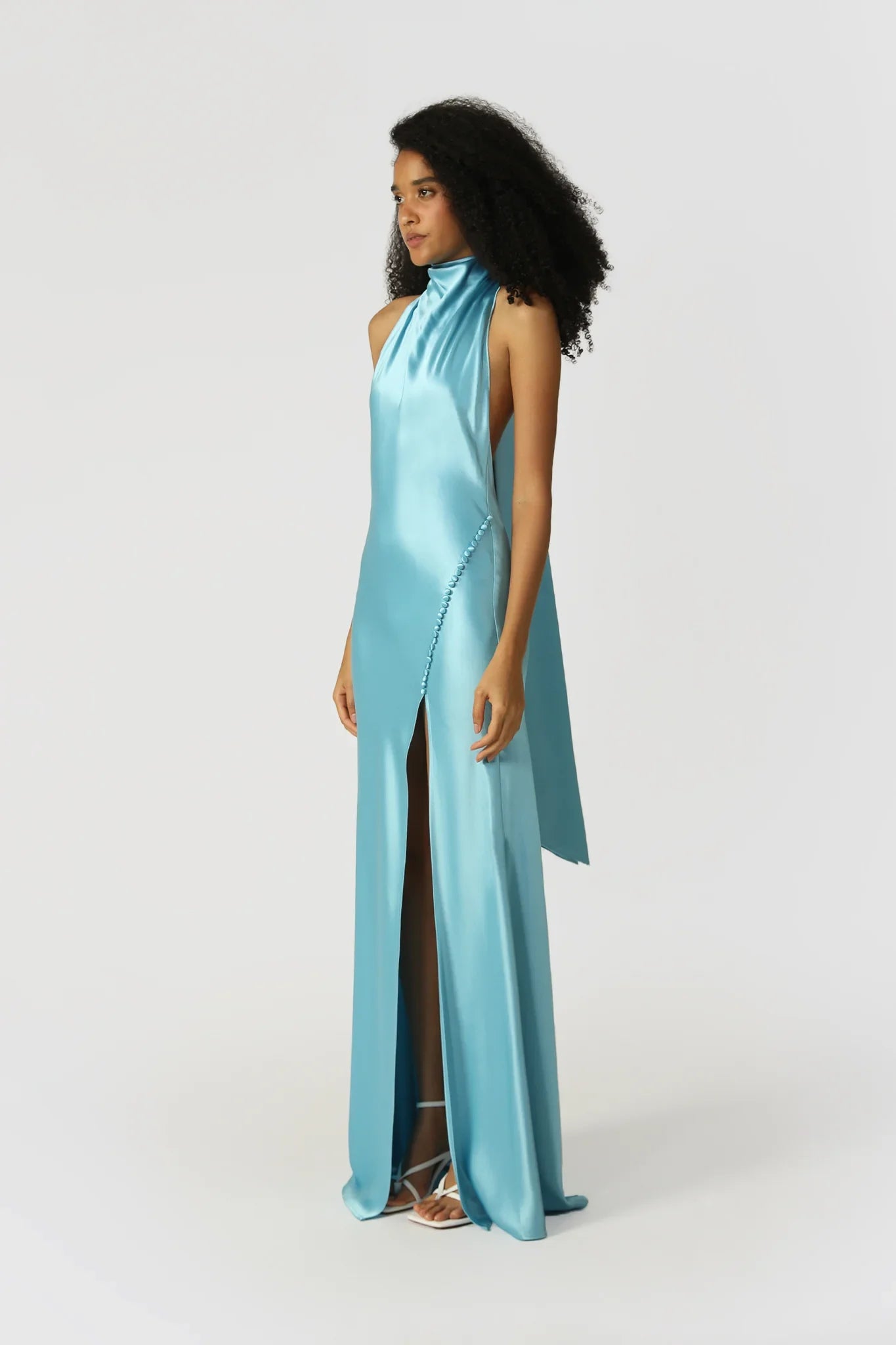 Penelope is our top bestseller that is guaranteed to make you feel effortlessly beautiful and captivating. A stunning bias-cut satin gown featuring a high neck, a low-cut back and open sides, a thigh-high side slit with covered button detail at the hip, and large statement wings at the back of the neck.