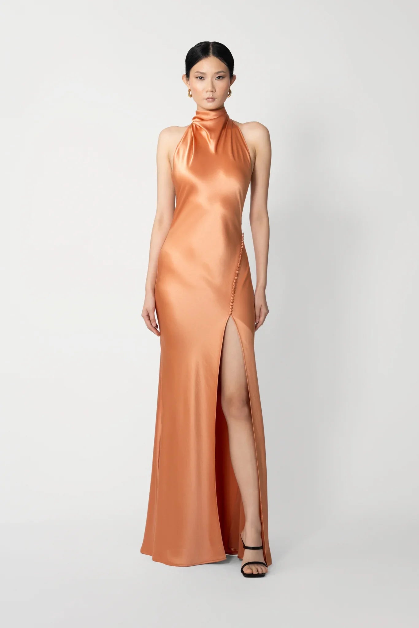 Penelope is our top bestseller that is guaranteed to make you feel effortlessly beautiful and captivating. A stunning bias-cut satin gown featuring a high neck, a low-cut back and open sides, a thigh-high side slit with covered button detail at the hip, and large statement wings at the back of the neck.