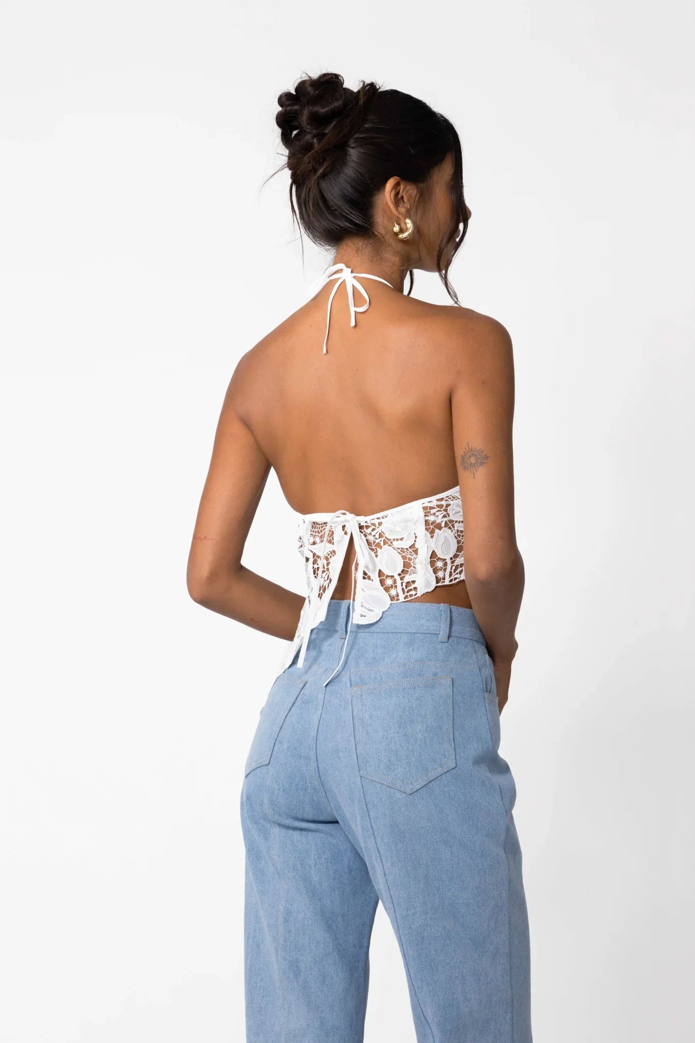 Backless halter neck lace top with string neck tie and asymmetrical scalloped hem