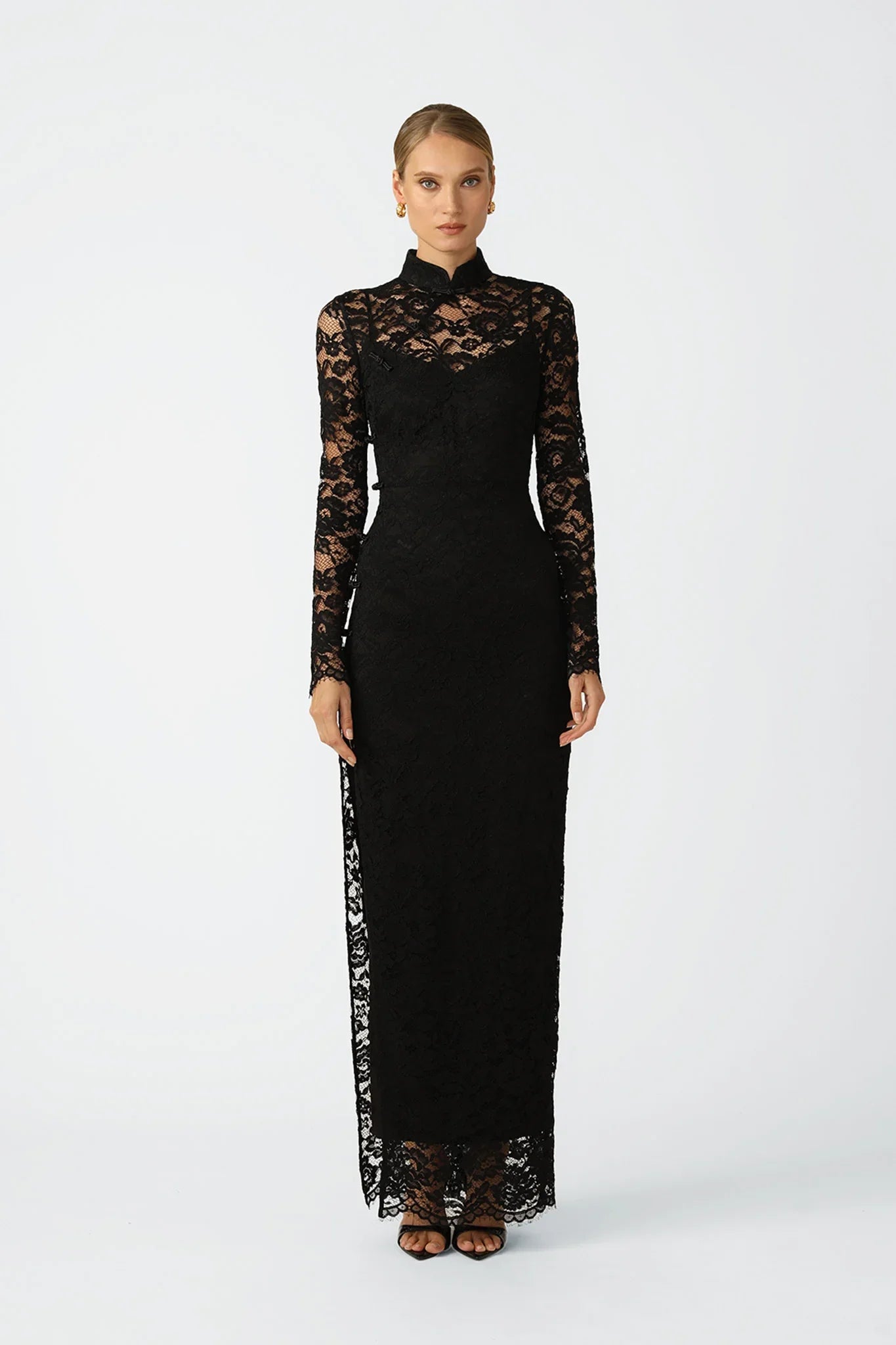 Rebecca is a Cheongsam-inspired full-length lace dress with a thigh-high slit. Semi-sheer with a Mandarin collar and classic pankou button details.