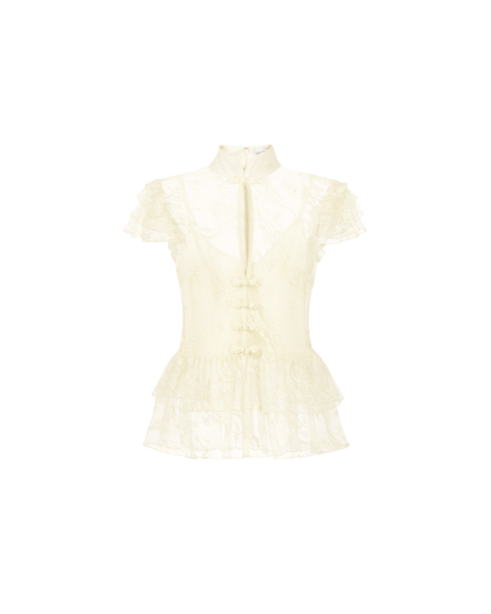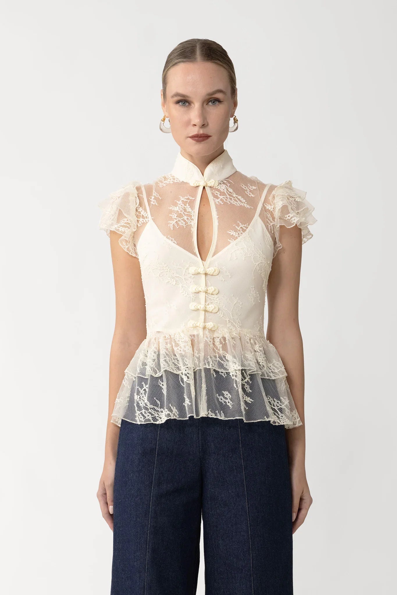 The Roux Top is a romantic lace piece designed with a mandarin collar, hand-tied pipa knots, and a front keyhole cut-out. It comes with a matching lining for added coverage. Pair it with the Brooklyn Denim Pant for an elevated casual look.