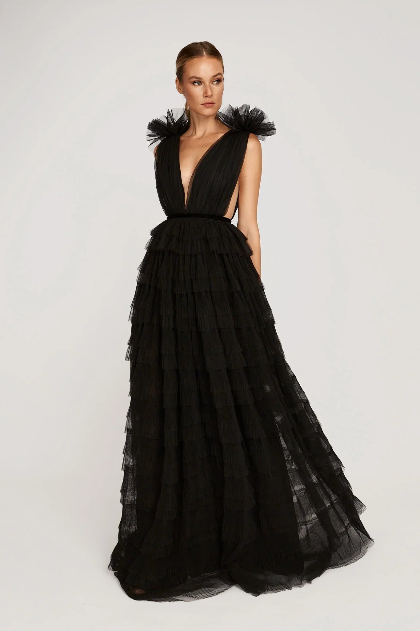 Romantic open-back ruffled gown featuring swathes of flocked tulle cascading to a sweeping hem with plunging neckline