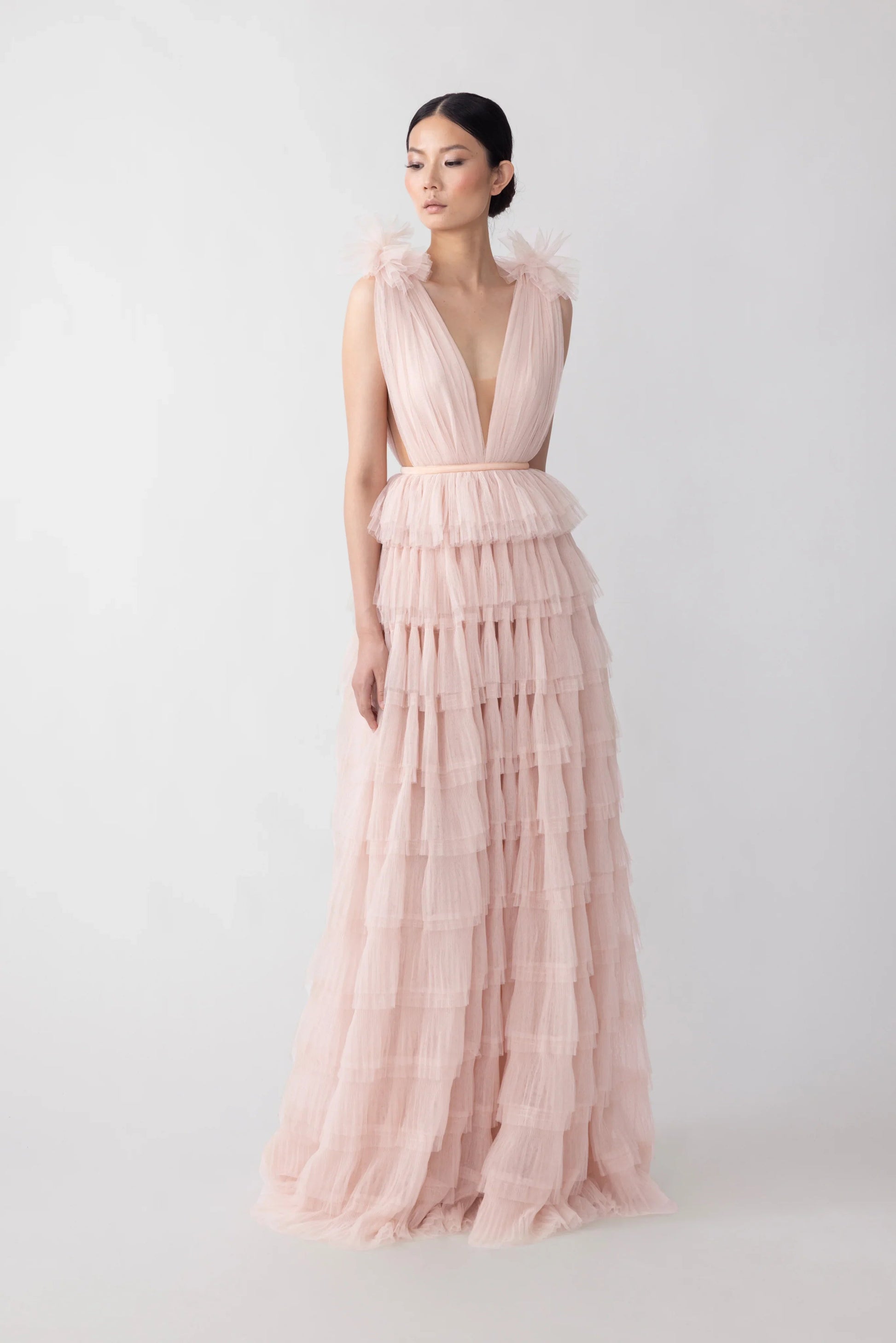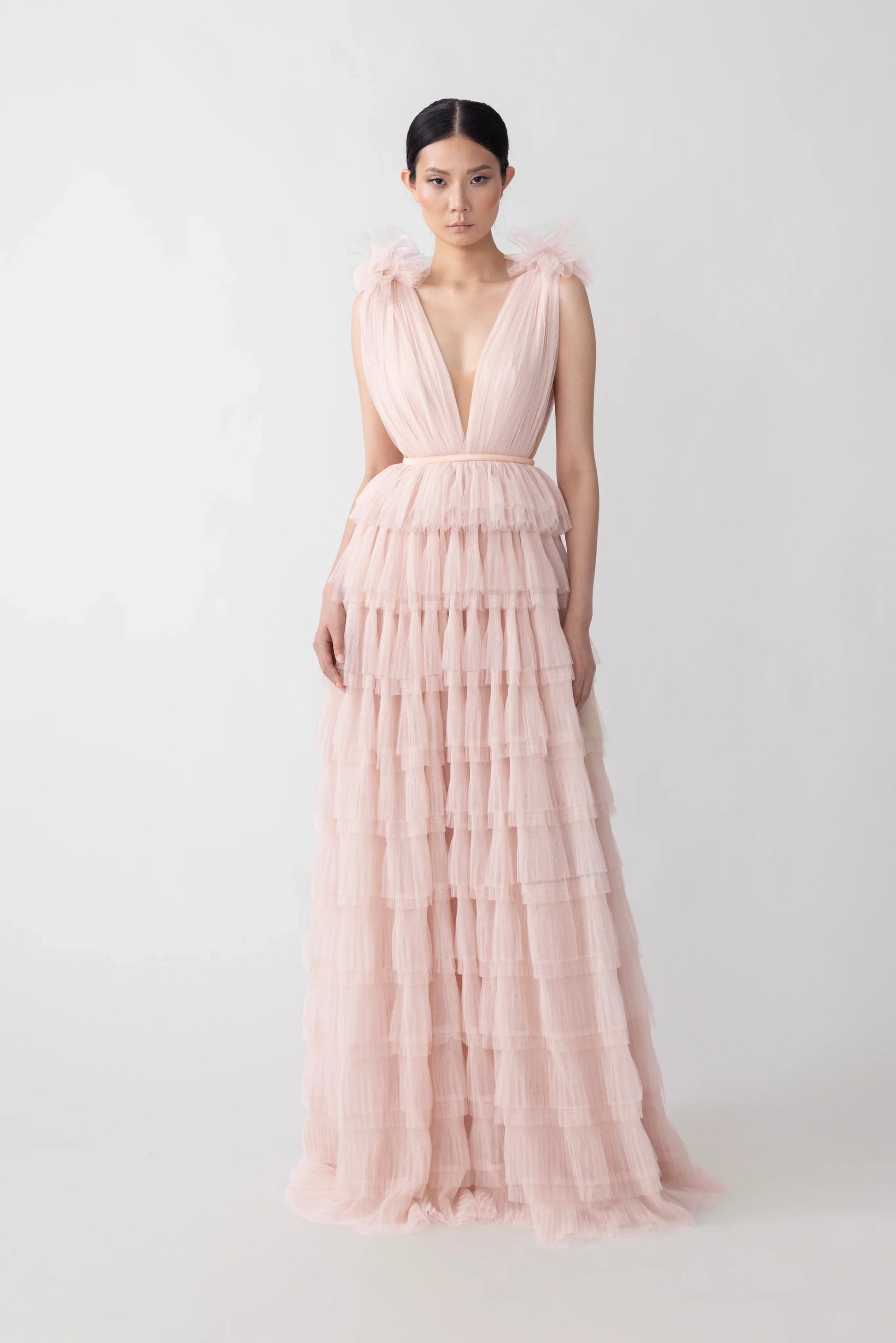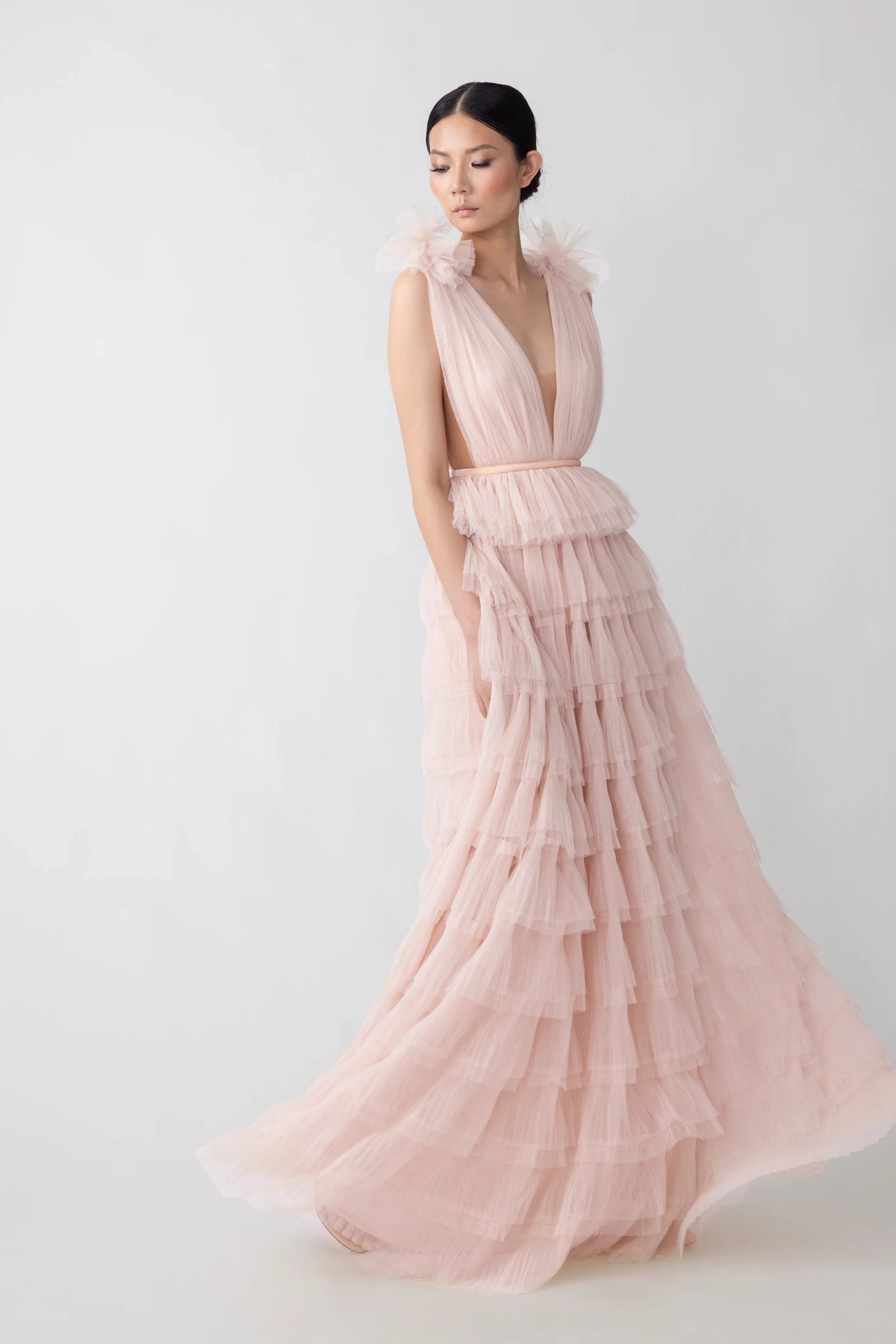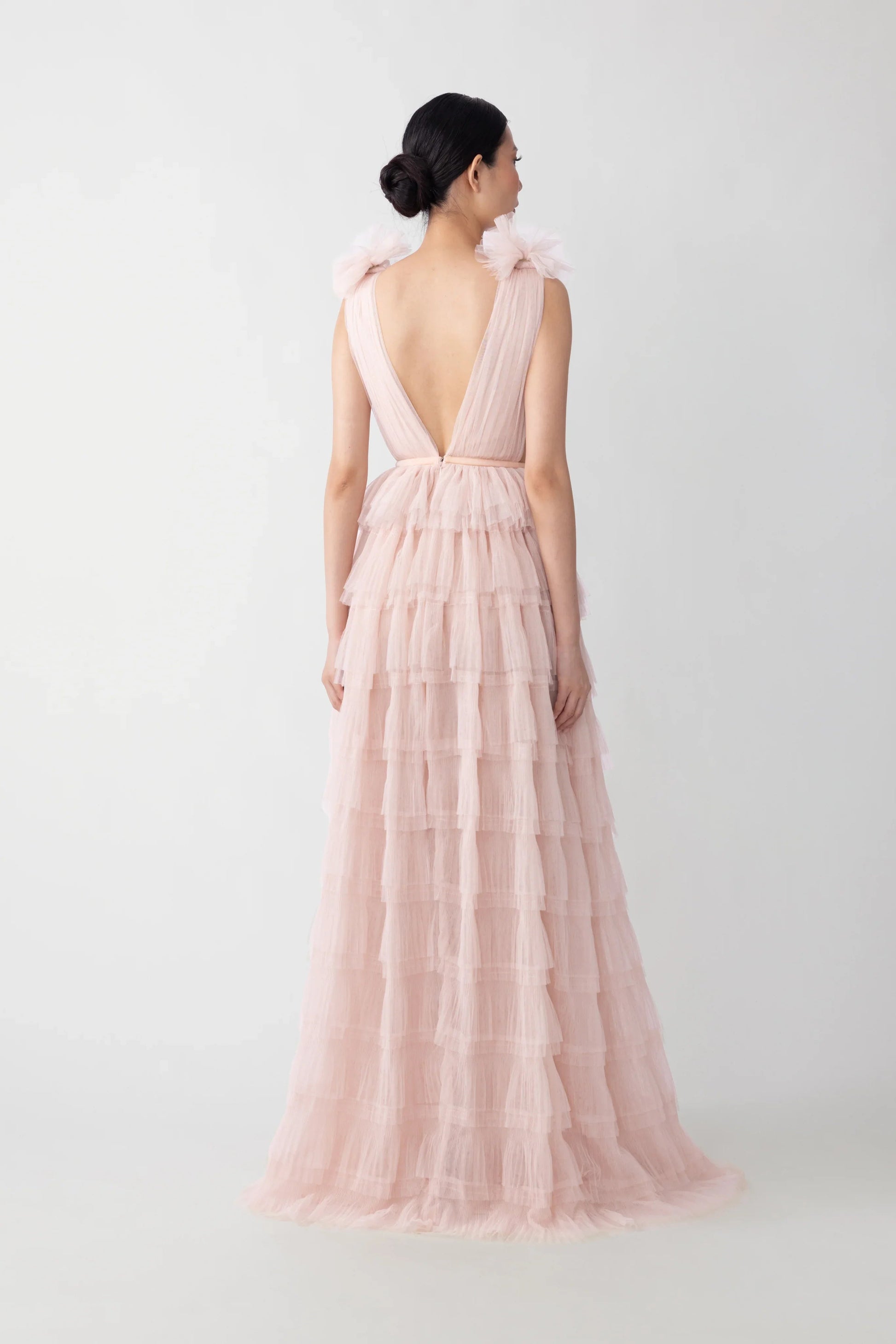 Romantic open-back ruffled gown featuring swathes of flocked tulle cascading to a sweeping hem with plunging neckline