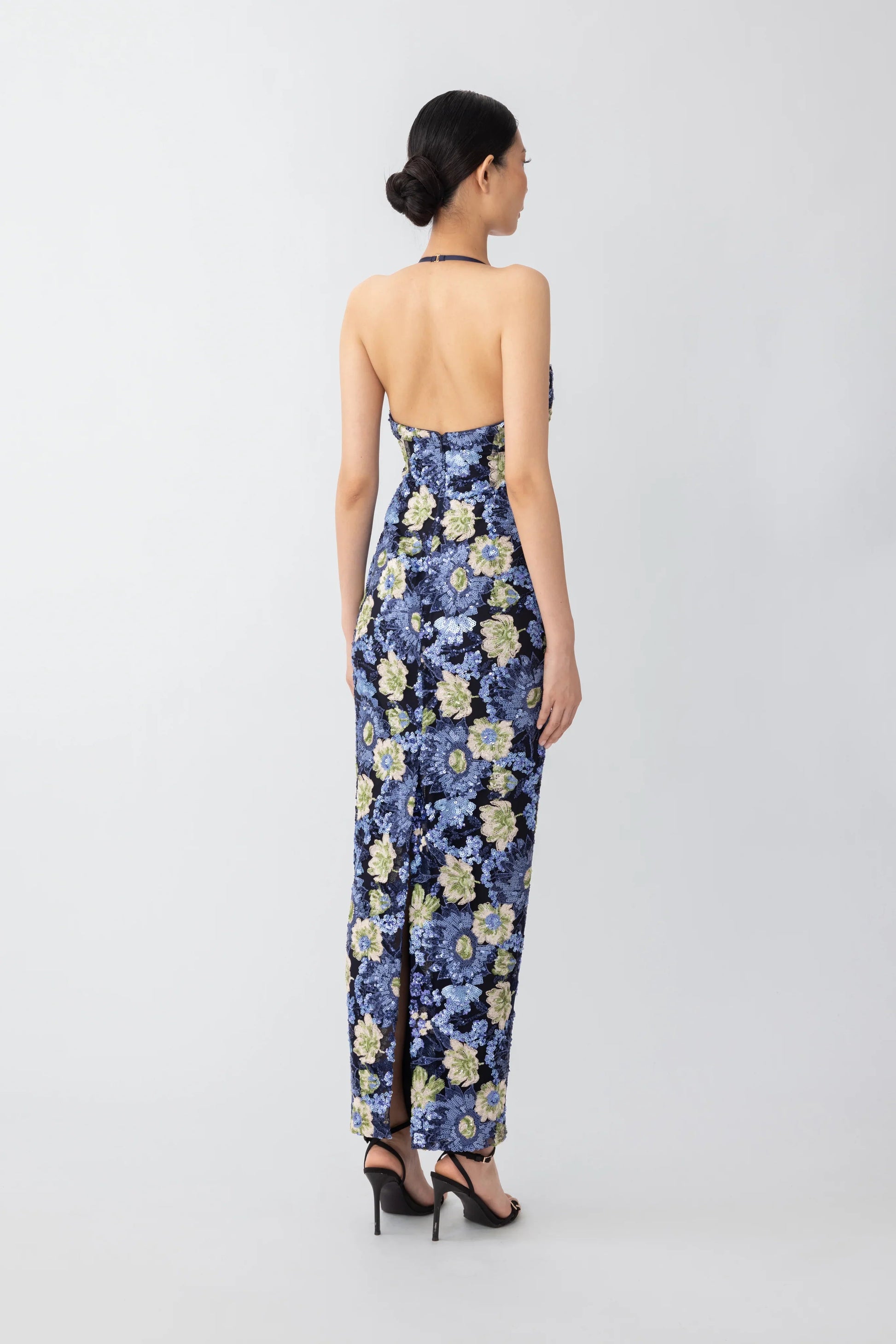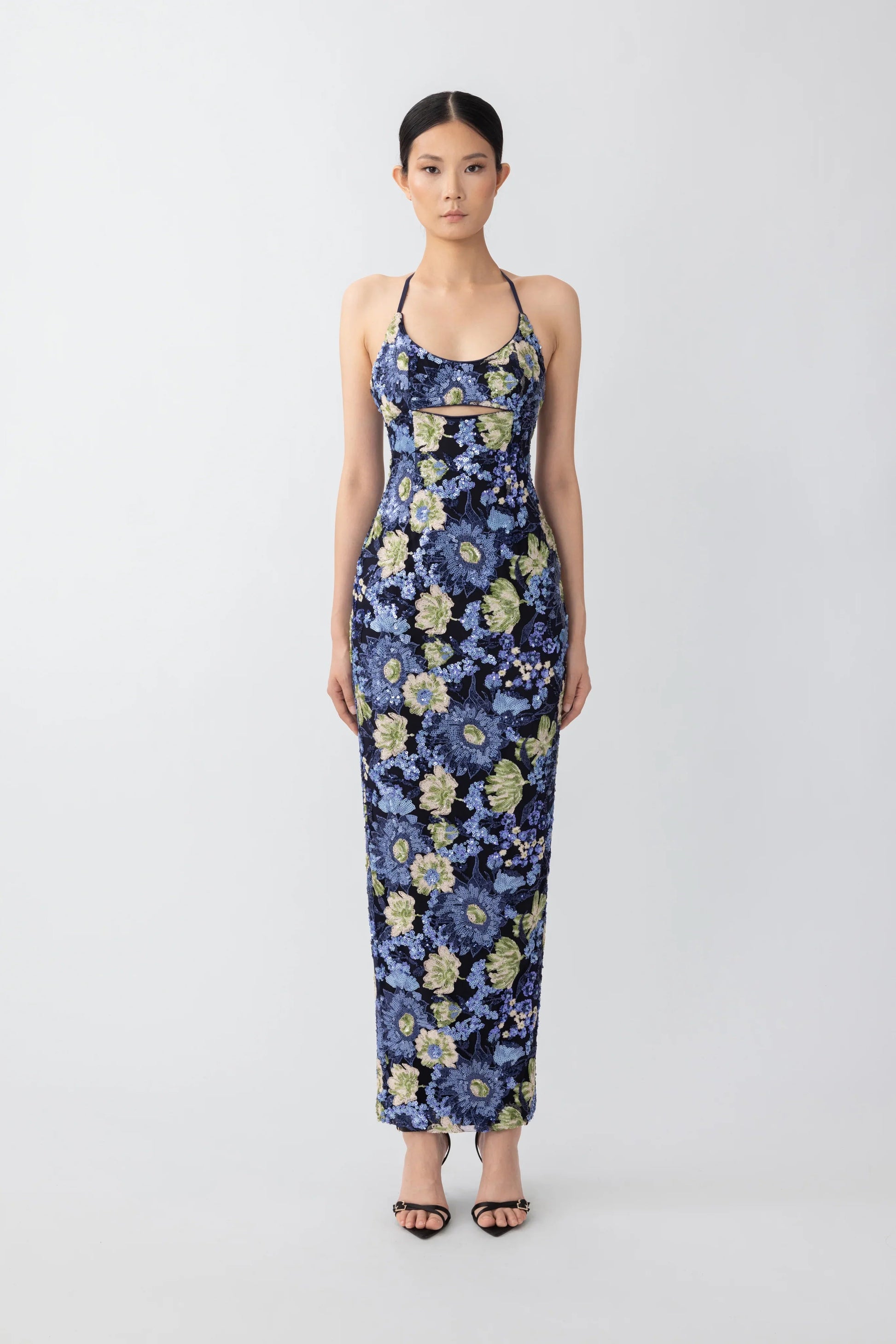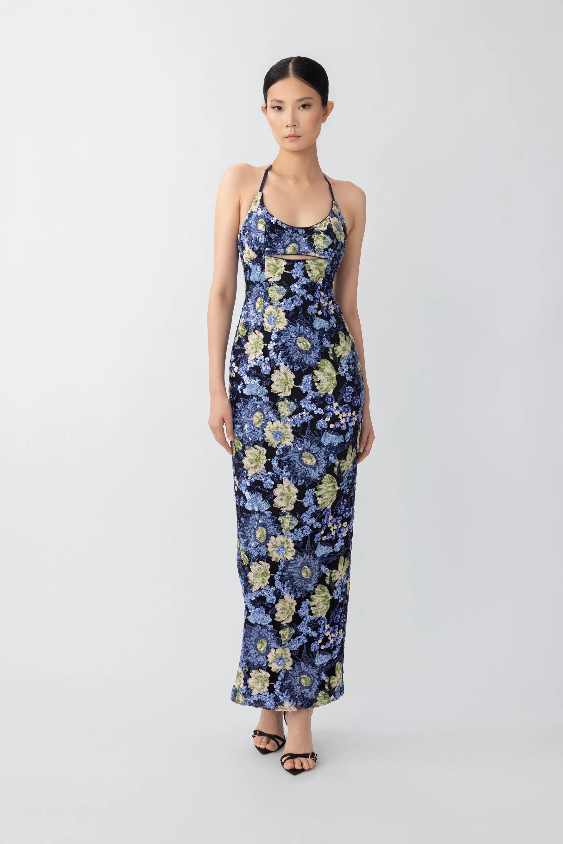 Embellished maxi dress with a halter neckline, small cutout on the bust and a back slit
