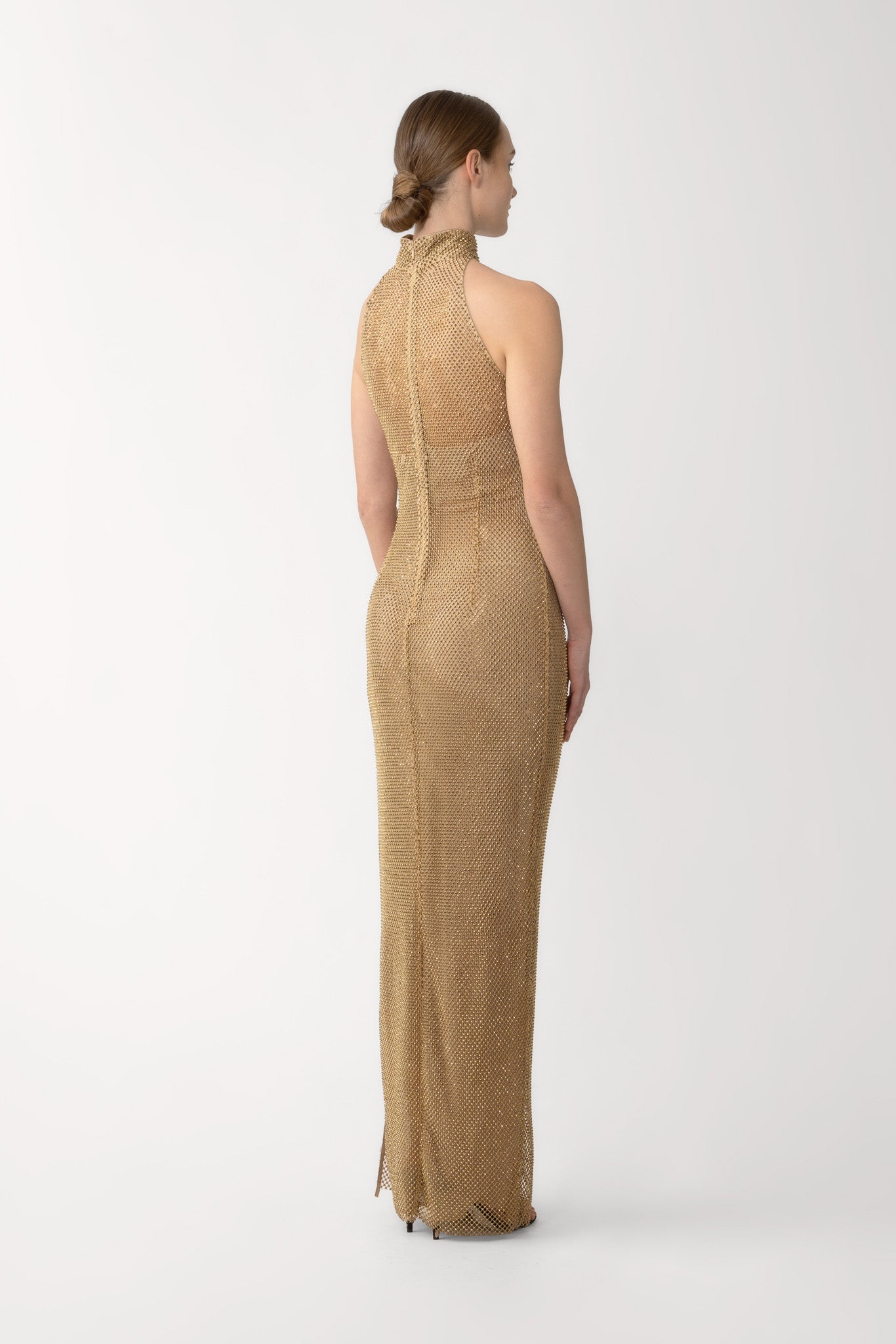 The Santana Dress is a floor-length gown embellished with crystals. Featuring a cheongsam-inspired silhouette with a mandarin collar and hand-tied pipa knots along the side. Comes with a matching slip.