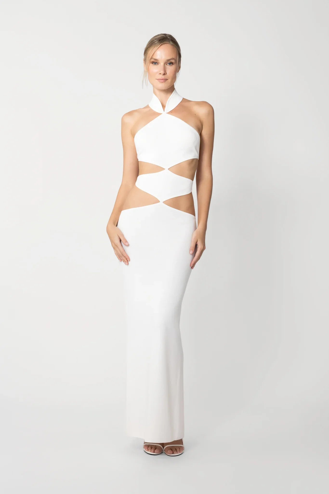 Bodycon cutout midi dress in viscose knit with open back and modified mandarin collar