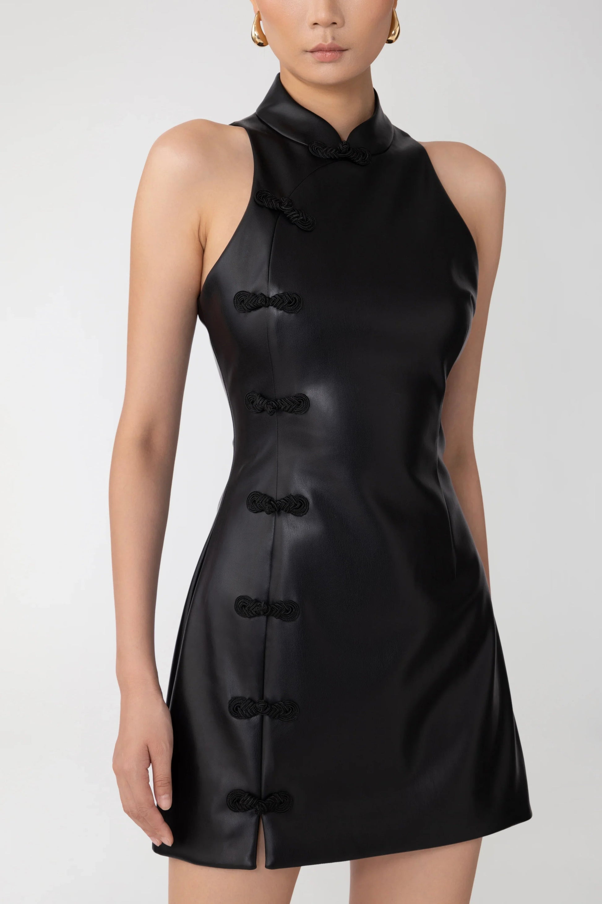 Modern Cheongsam faux leather mini dress featuring a Mandarin collar and signature hand-tied pipa knot button detail on the side seam.