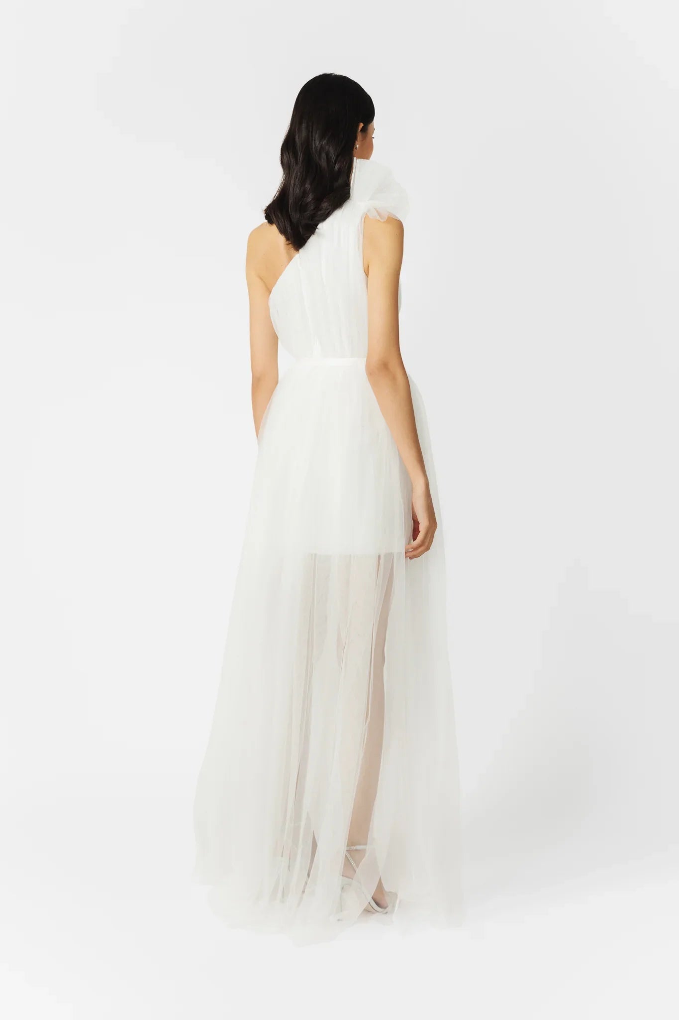 Sidney is a one-shoulder mini dress meant for significant celebrations. Its fully ruched bodice and ethereal ruffle at the shoulder give way to a wrap-style skirt attached to a removable flowing tulle train — a silhouette to feel radiant joy as you create treasured memories.