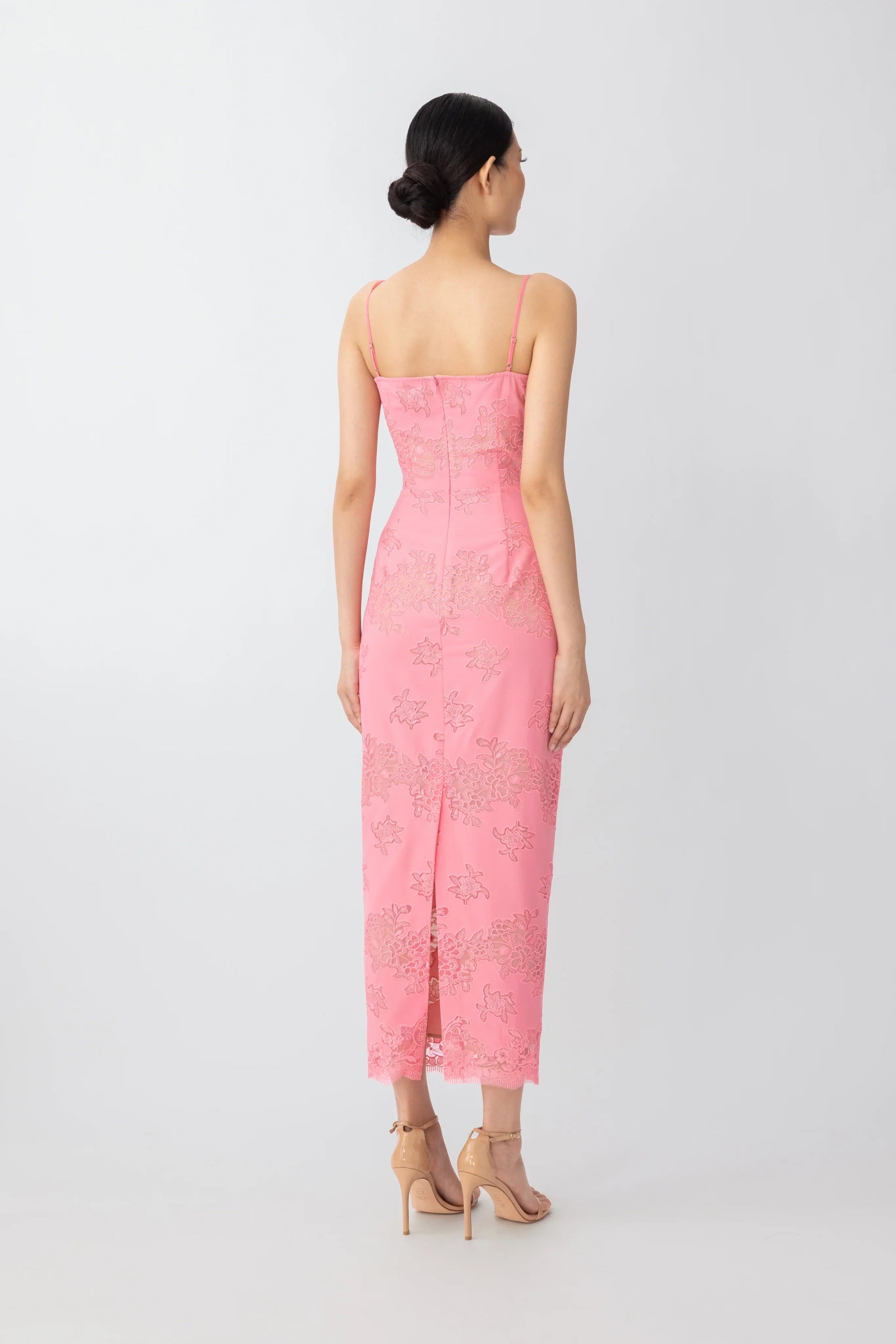Embroidered midi dress lined with chiffon with laser cut fabric and thin straps