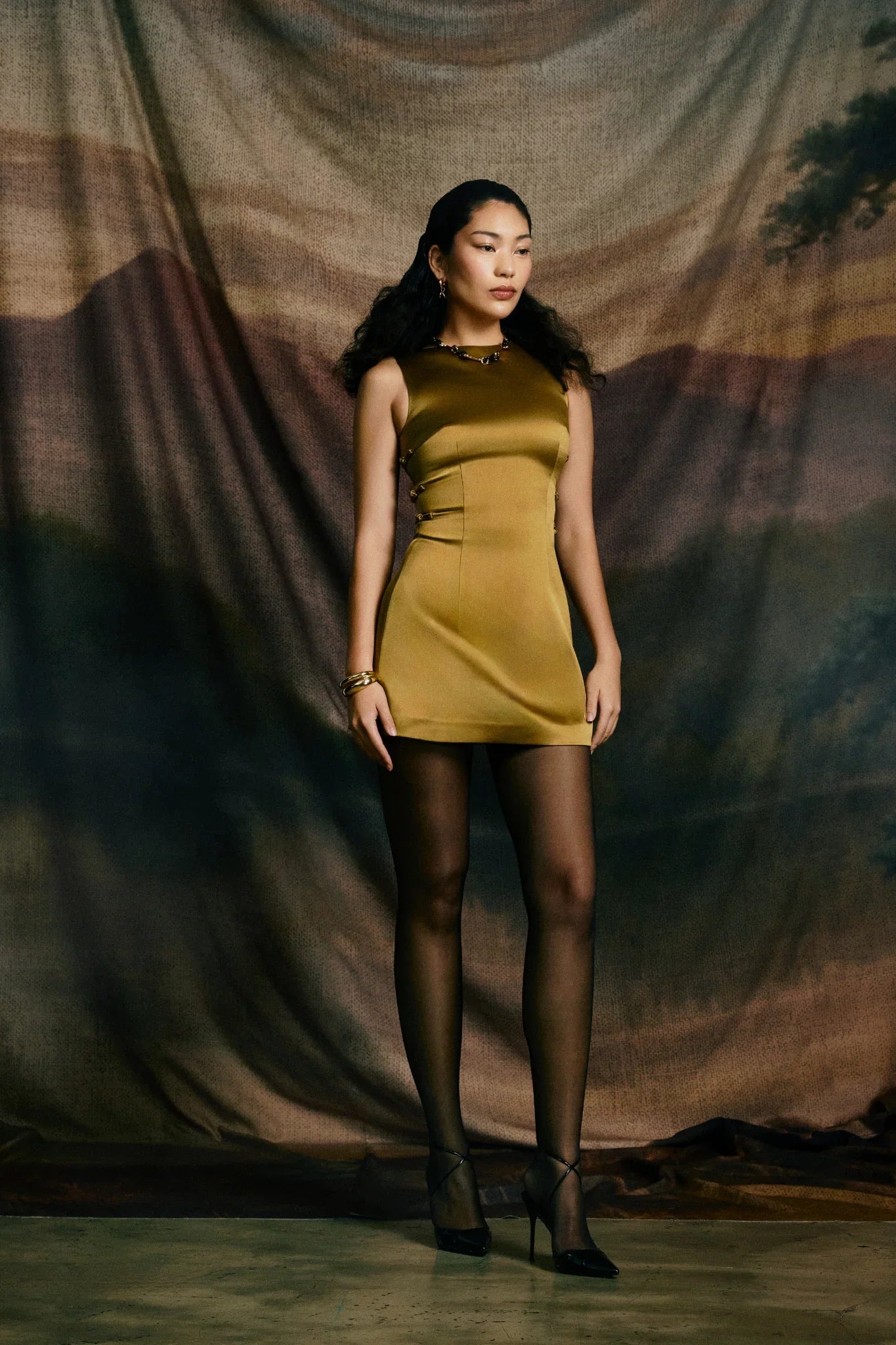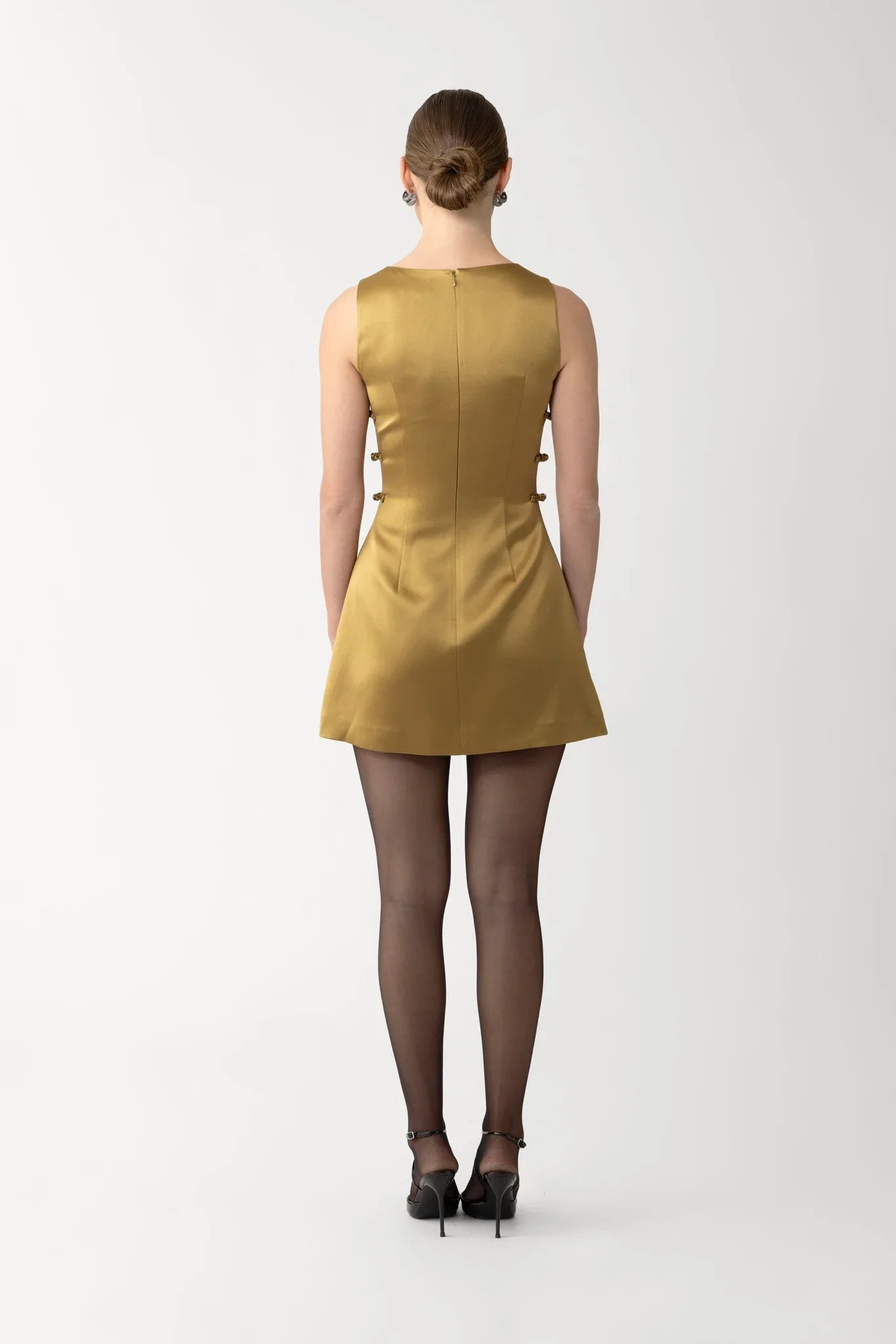 The Teddi Dress is a mini silhouette crafted from satin with a fitted bodice and A-line skirt. Finished with pankou buttons along the side, it’s a refined piece designed for day-to-evening wear.