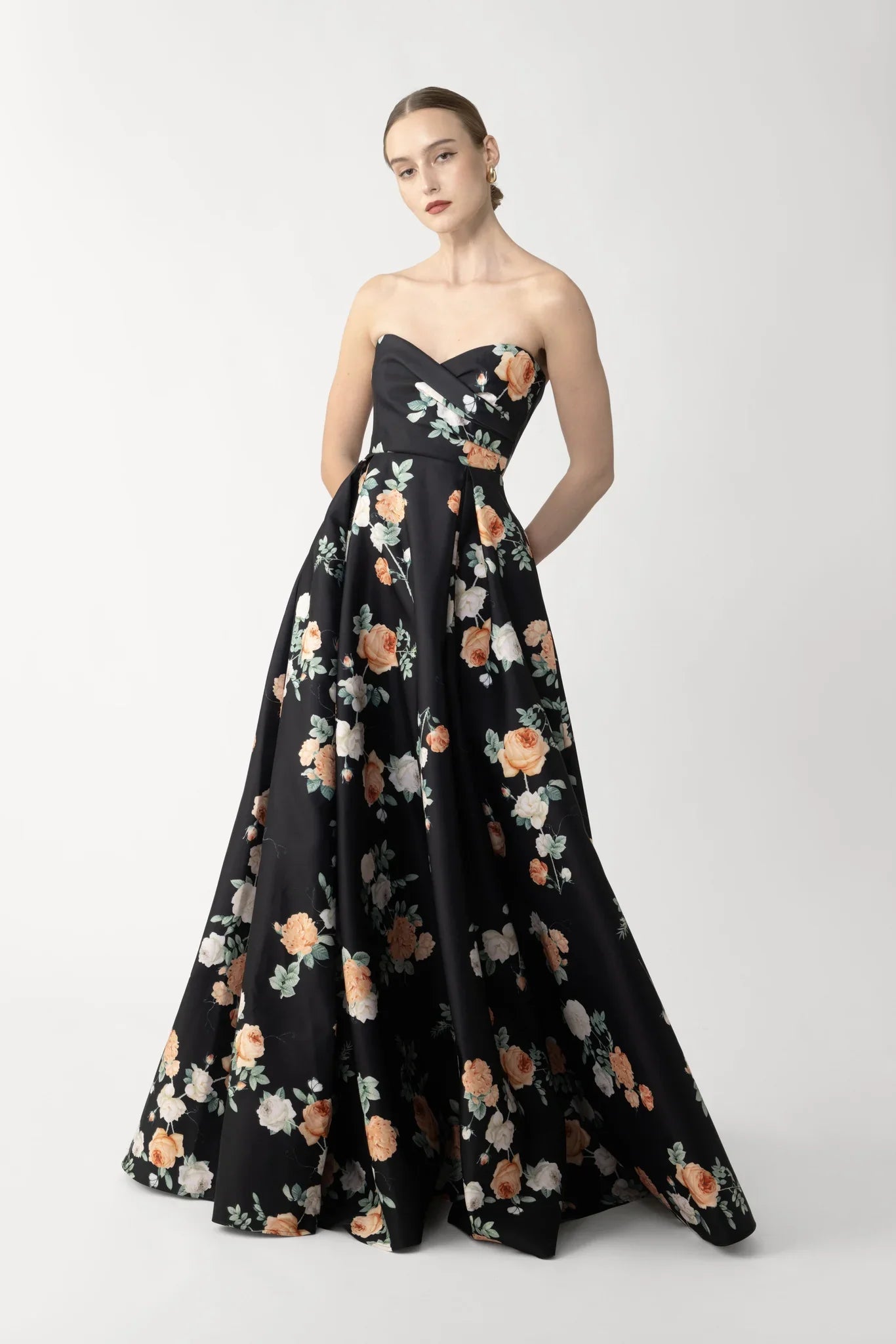 The Tiffany Gown is cut from glossy satin with a sweetheart neckline and a fully boned bodice for a structured look. Crafted in an original print featuring peach and ivory roses, this gown exudes romance and drama.