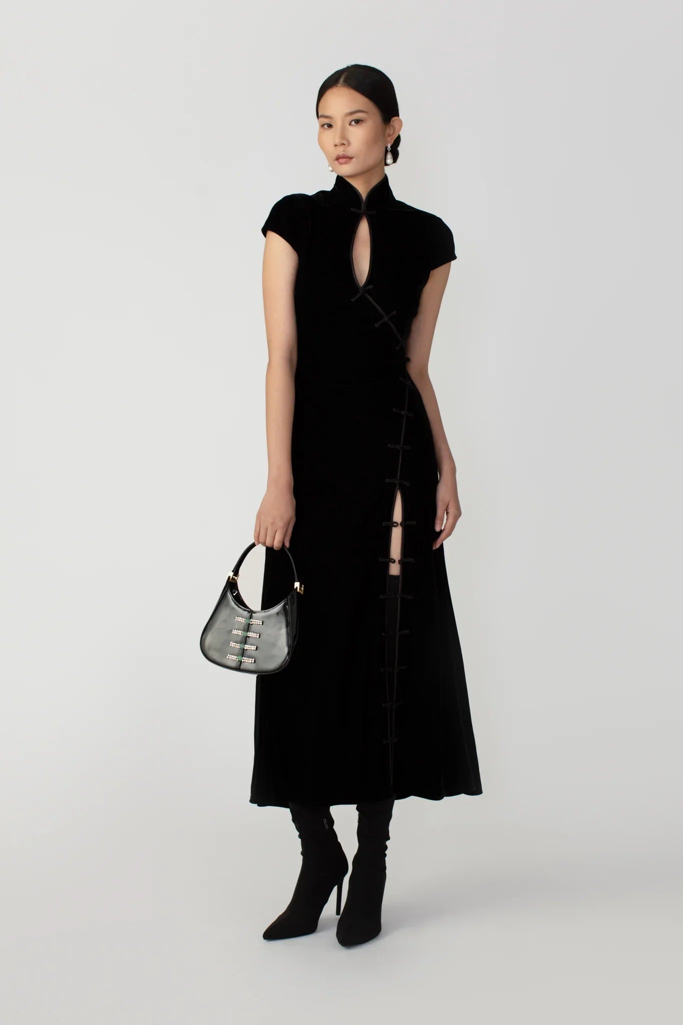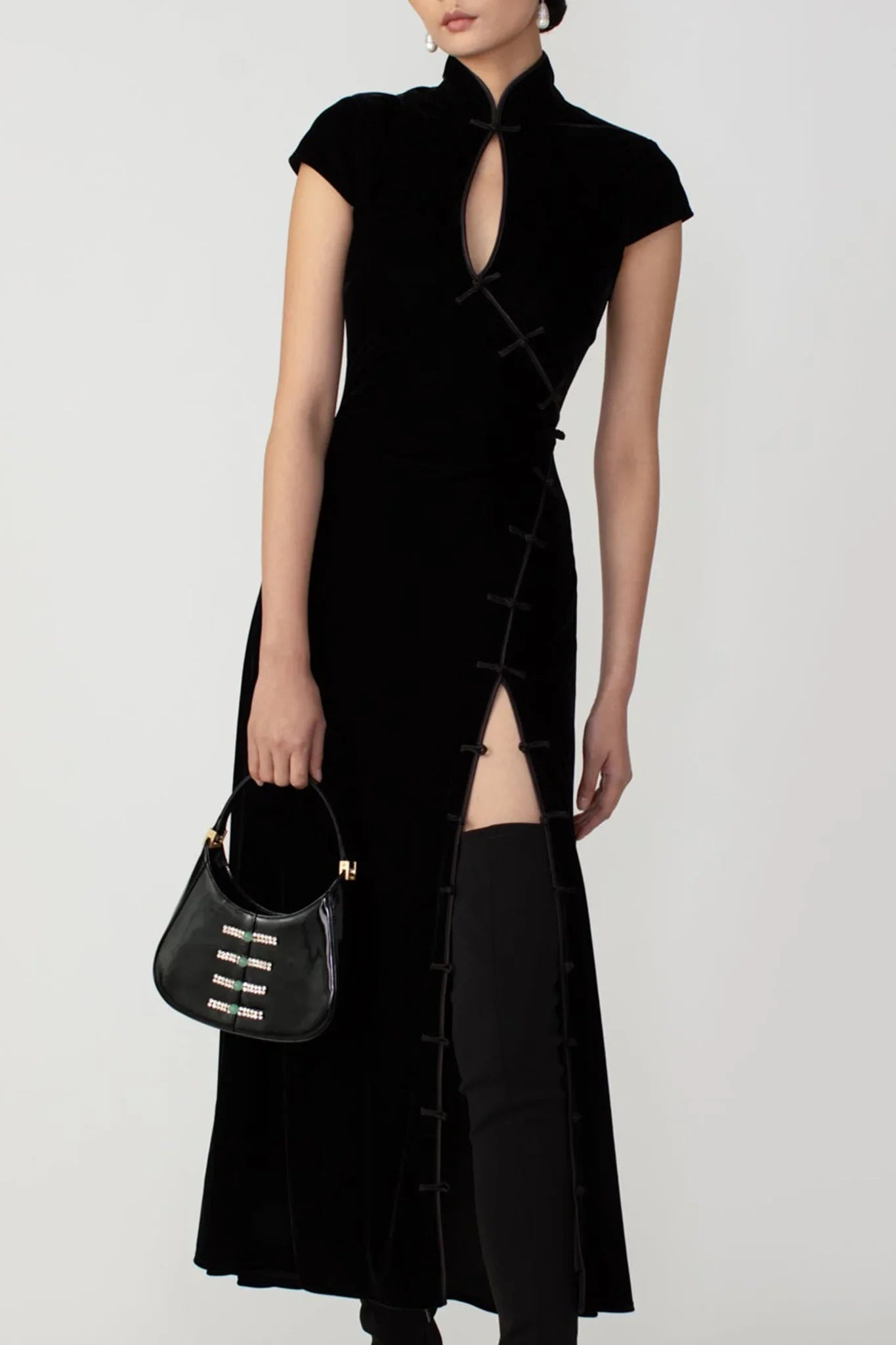 Vanessa is a Cheongsam-inspired velvet midi dress featuring a keyhole cut-out with a Mandarin collar, capped sleeves, and decorative classic pankou buttons.