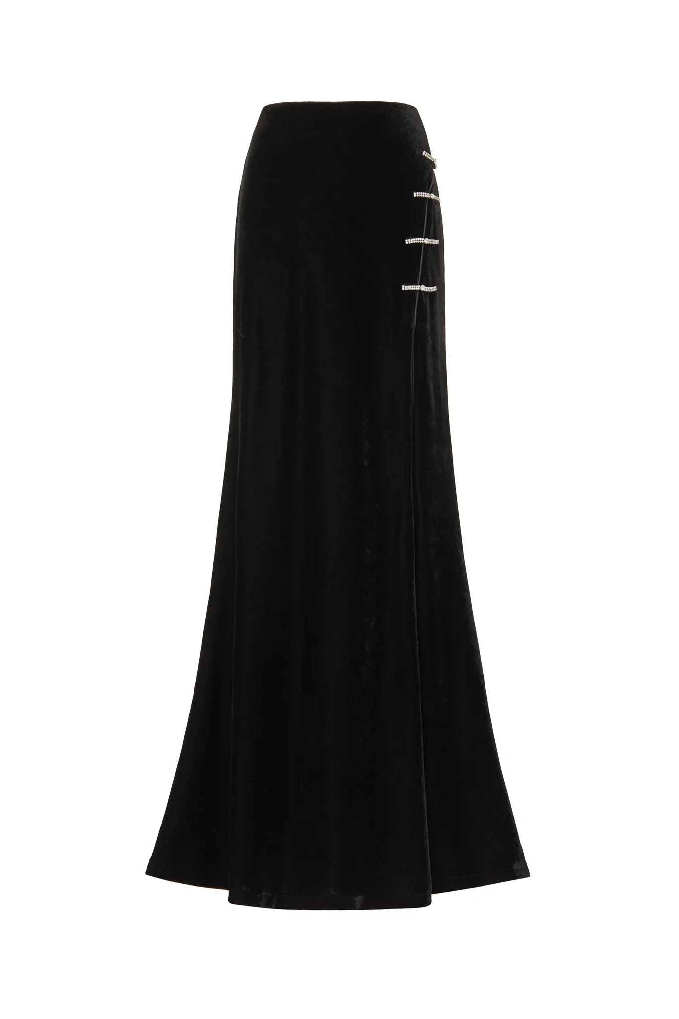Bias-cut maxi skirt with a thigh-high slit featuring straight crystal pankou button detail