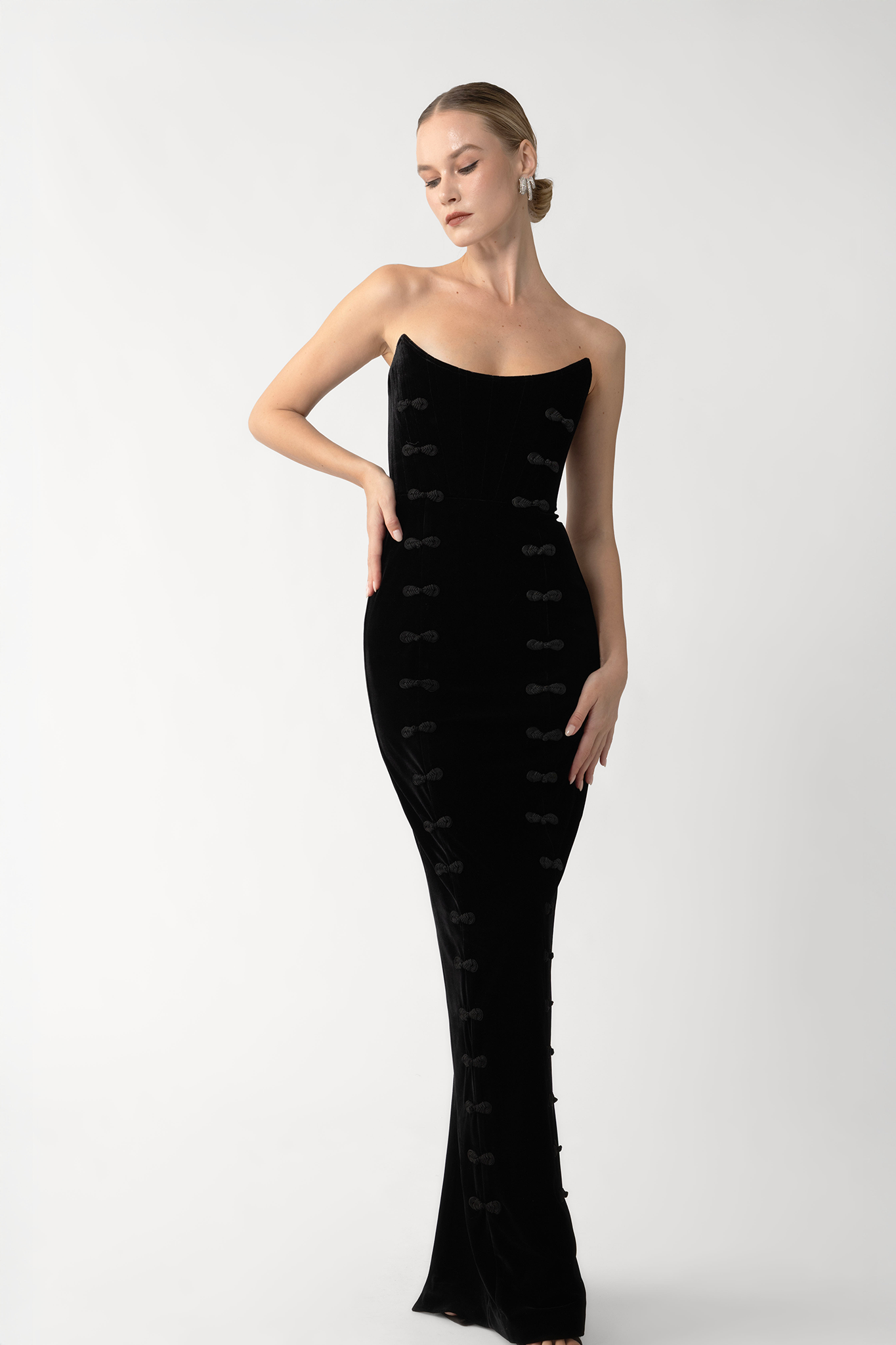 The Vesper Gown is a full-length silhouette in velvet, with hand-tied pipa knots tracing the front. A fully boned corset and fitted skirt sculpt the body with refined structure.
