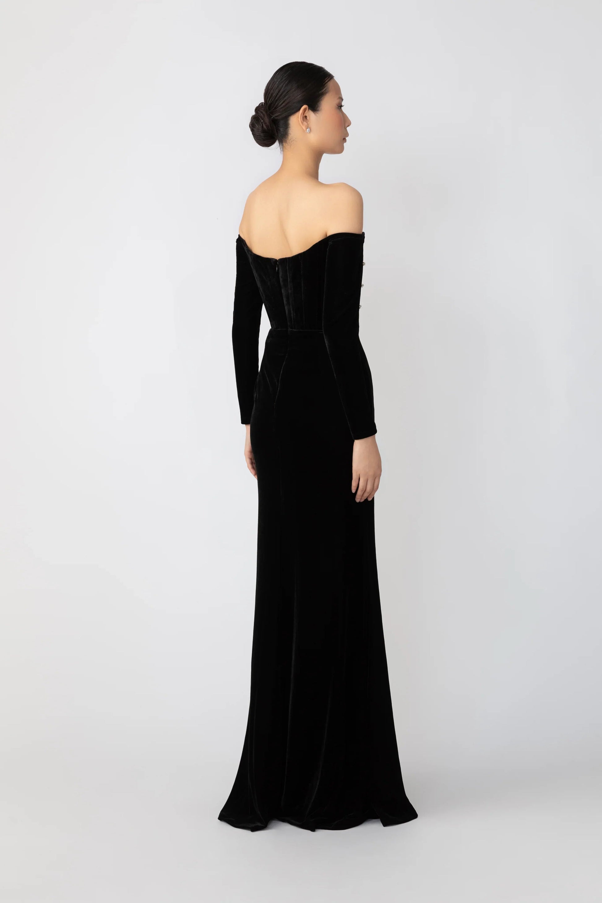 Off-shoulder gown with long sleeves and a thigh-high slit featuring our signature crystal pipa knot button detail