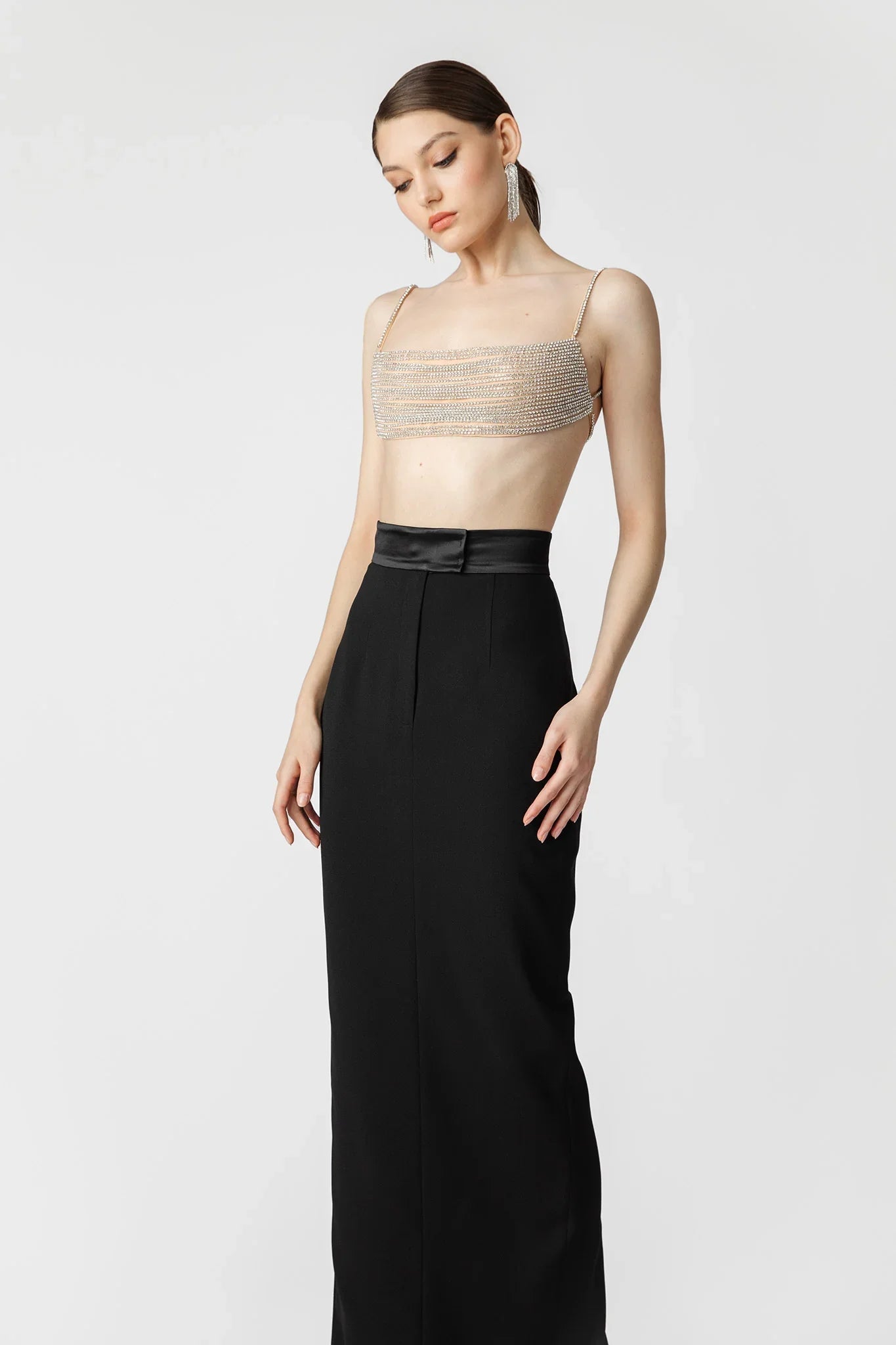 Zafina is an ethereal top that exudes an ultra-feminine charm. A backless bralette made with individually hand-sewn strands of crystals fastened with a single crystal strap at the back.