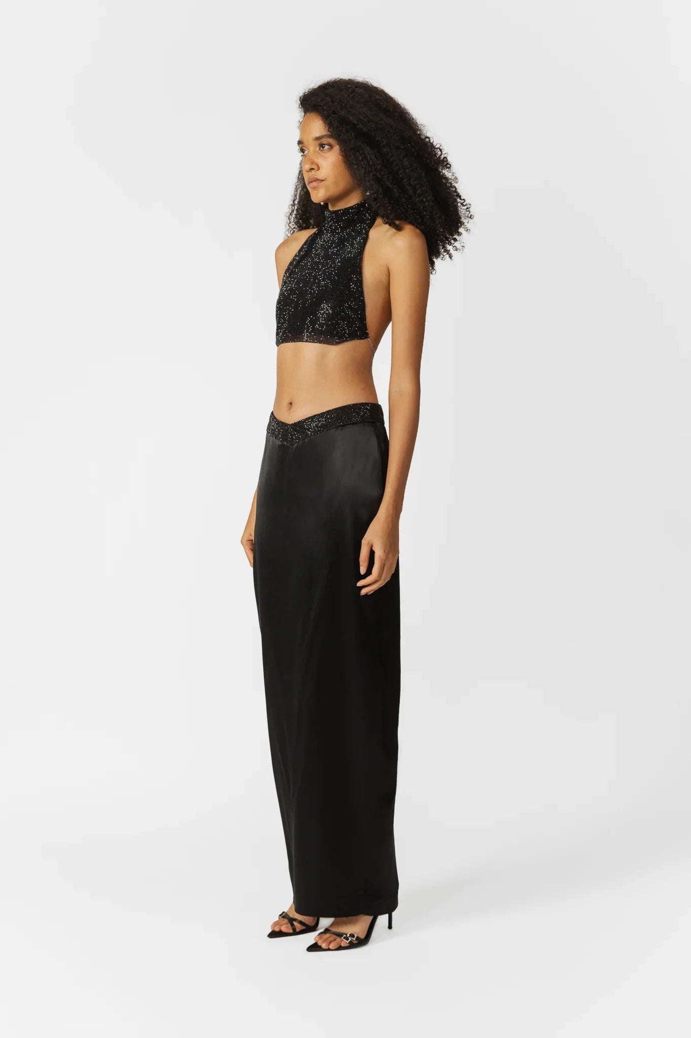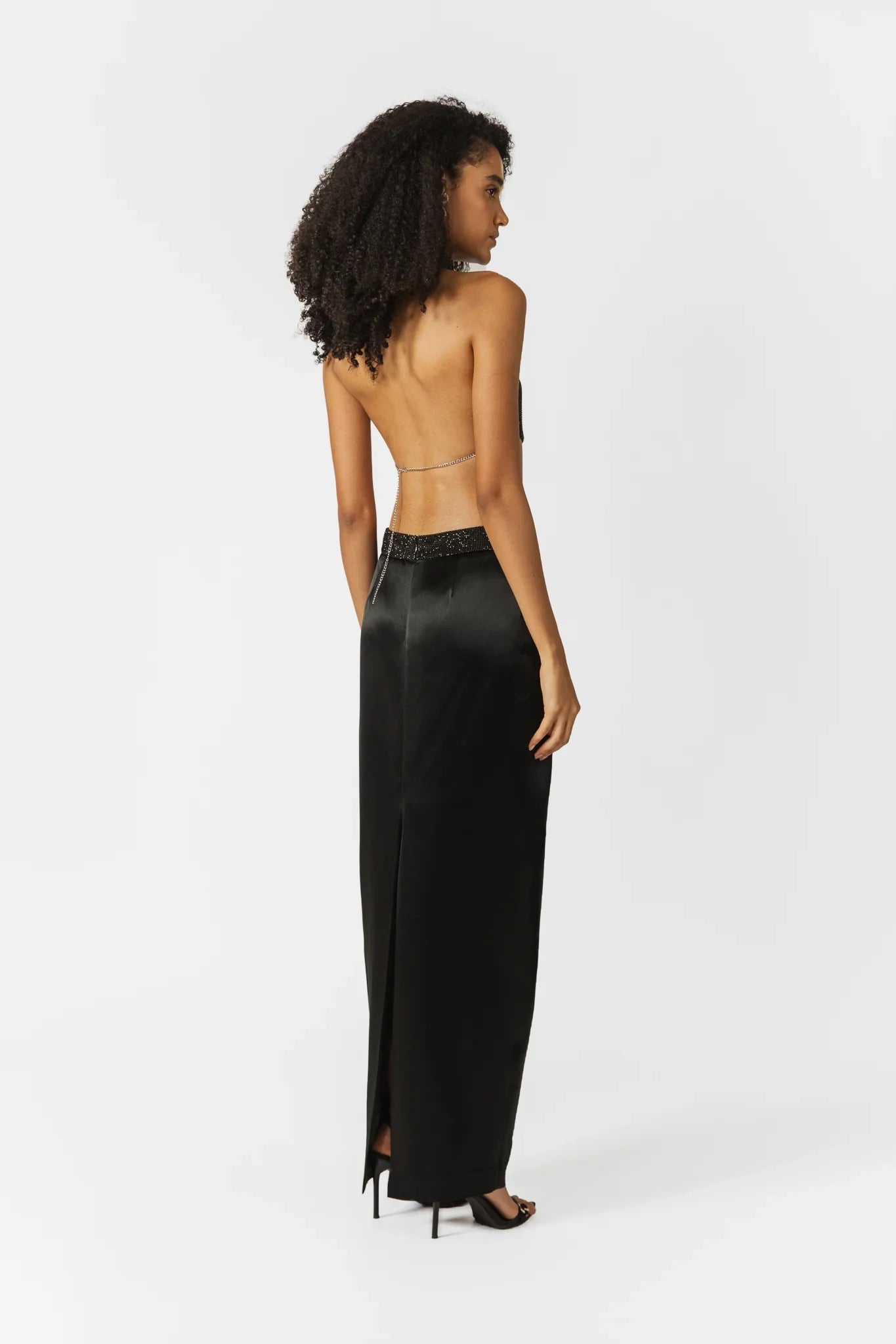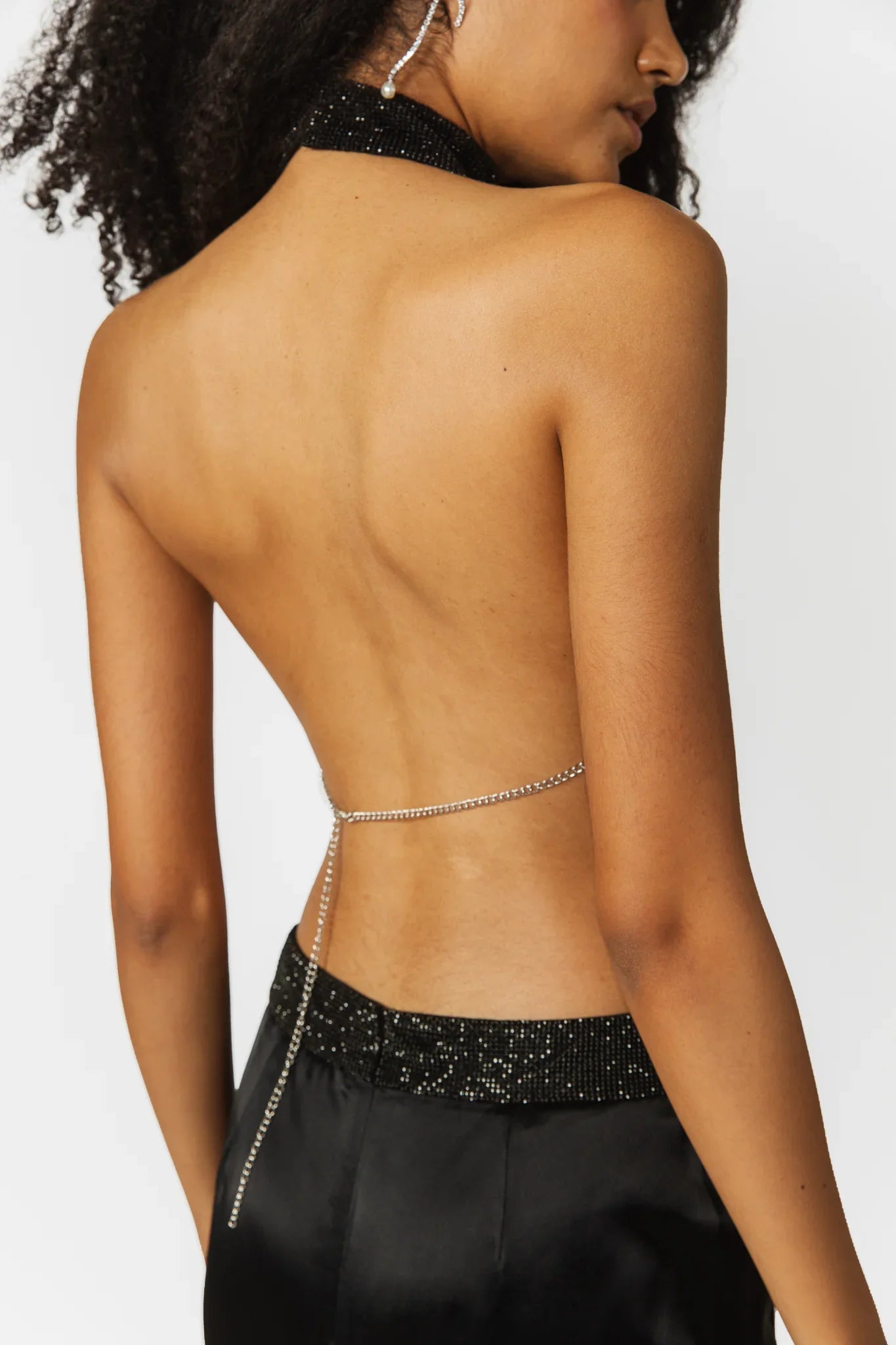 Zyan is a striking two-piece set for evenings of allure. The crystal-embellished metal mesh halter neck top secured by a chain strap at the back creates a daringly sensual silhouette, paired with a mid-rise pencil skirt in lustrous satin accentuated by a sparkling metal mesh waist trim — a vision that exhilarates and empowers.